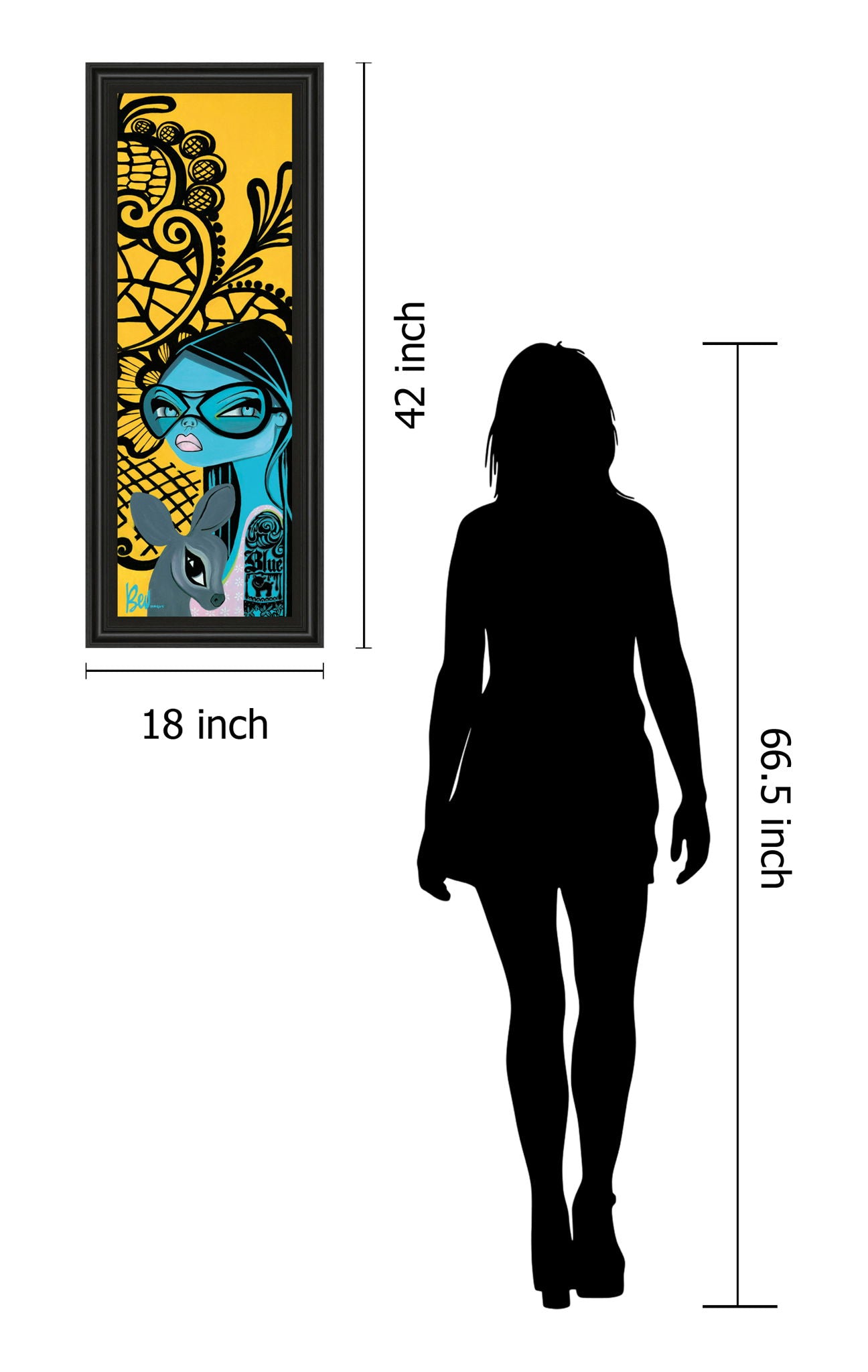 This captivating piece invites you into a world where bold colors and whimsical imagery collide. Featuring a stylized portrait of a woman with oversized glasses and a small deer, set against a vibrant yellow and black patterned backdrop, it exudes a modern, artistic charm. The elegant black frame enhances the depth and sophistication of the mixed media artwork, making it a striking addition to living rooms or offices seeking a splash of contemporary flair and imaginative storytelling.