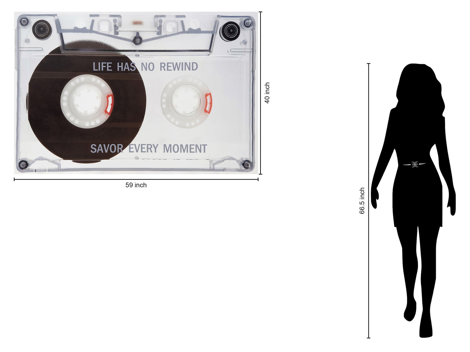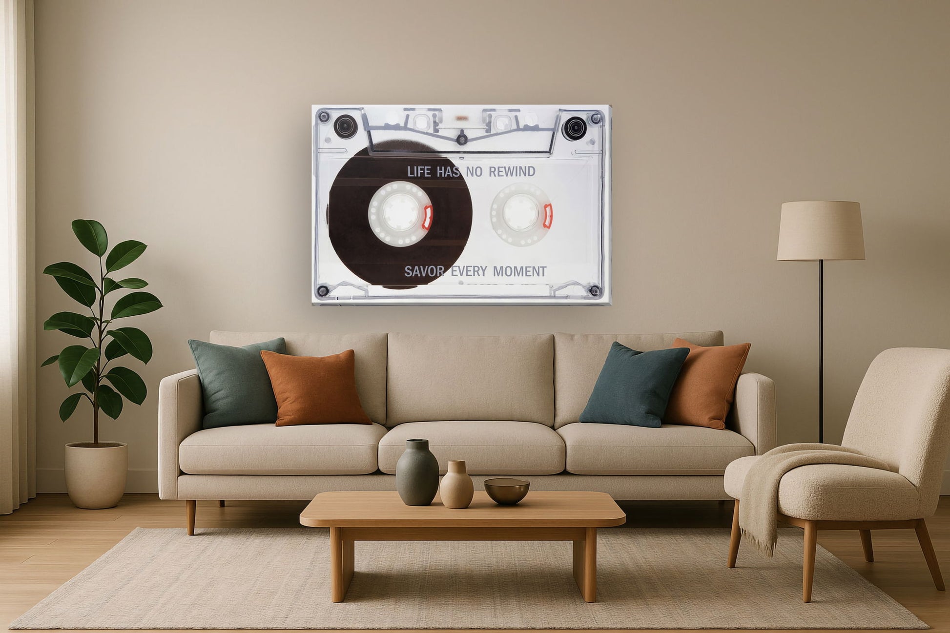 Capture the essence of nostalgia and motivation with "No Rewind Retro Cassette Inspiration," a contemporary graphic art piece printed on high-quality canvas. This large wrapped canvas features a clear cassette tape with the inspiring message "Life Has No Rewind, Savor Every Moment," reminding you to cherish every second. Perfectly suited for living rooms, offices, or bedrooms, it arrives ready to hang with professional mounting hardware, making it an effortless addition to your space. Beyond its visual appeal, each purchase supports a meaningful cause by donating a meal to a hungry American child, blending art with social impact.