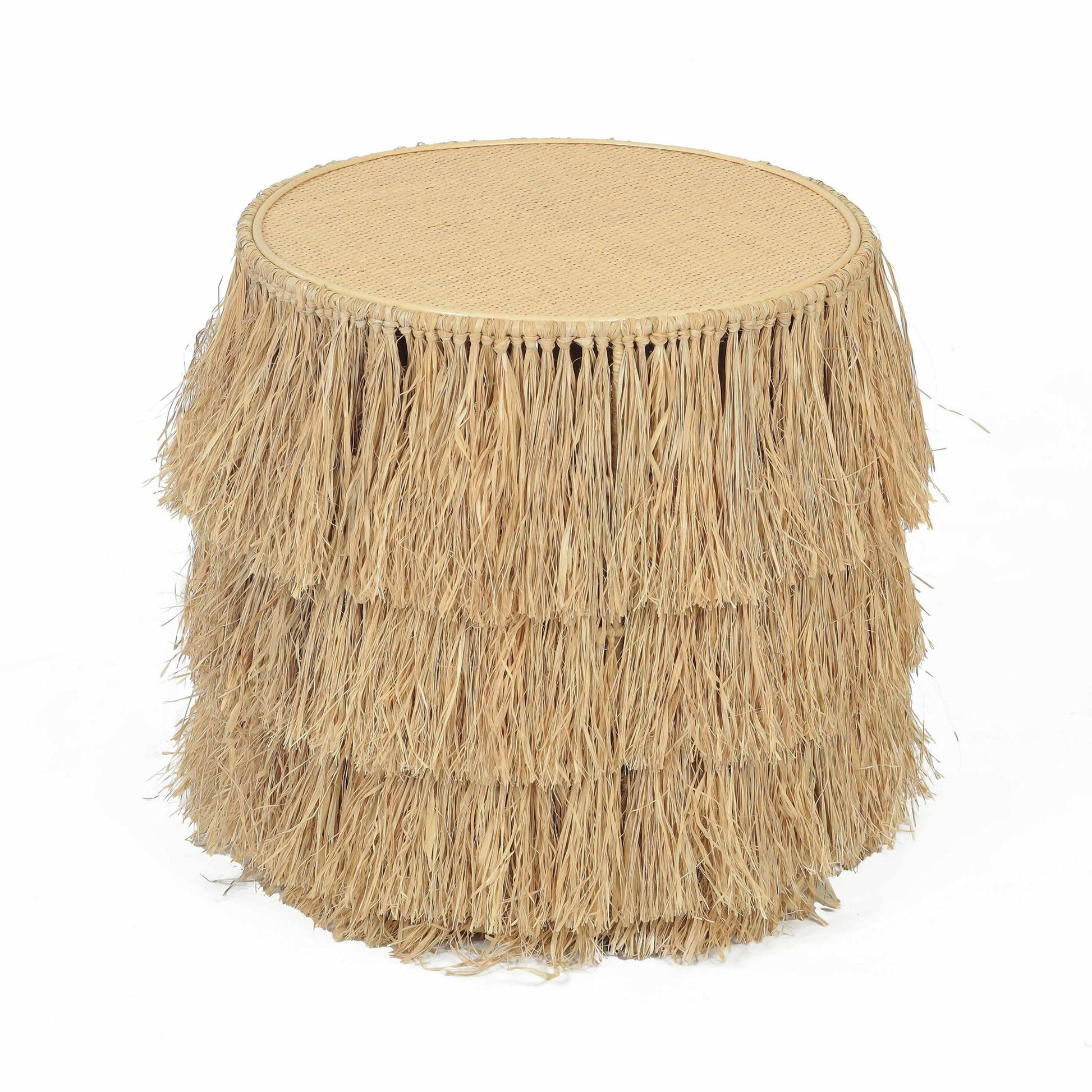 The Luau Natural Rattan Round End Table is your one-way ticket to vacation mode. Wrapped in tiers of flirty rattan fringe with a woven top, it's crafted from ethically harvested rattan and cane to bring that sunkissed, barefoot-by-the-beach energy right into your living room.