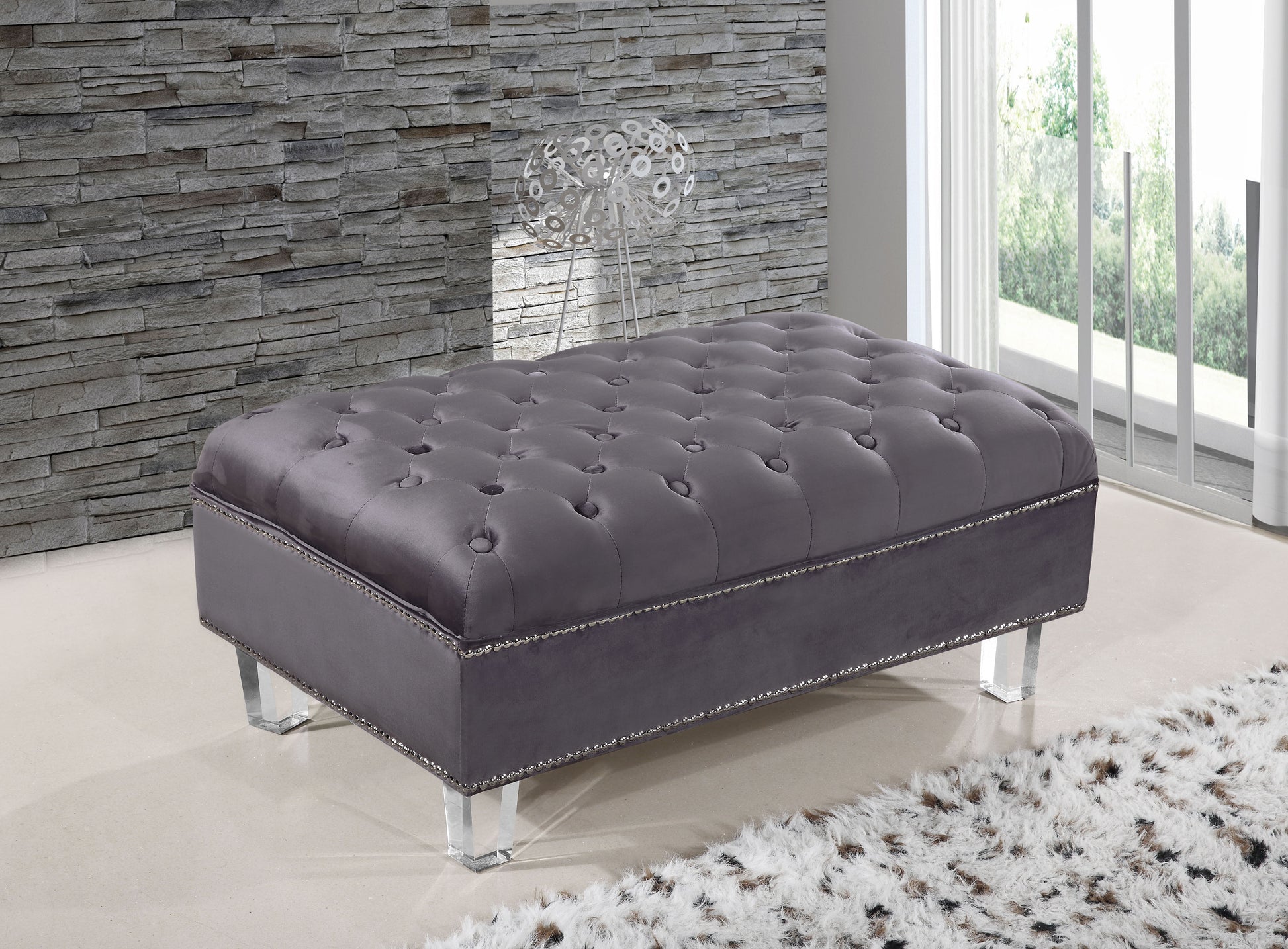 The Lucas Collection by Meridian Furniture. Features beautifully tufted velvet upholstery with a custom nail head design and clear acrylic legs. This collection is guaranteed to be the highlight of any home.