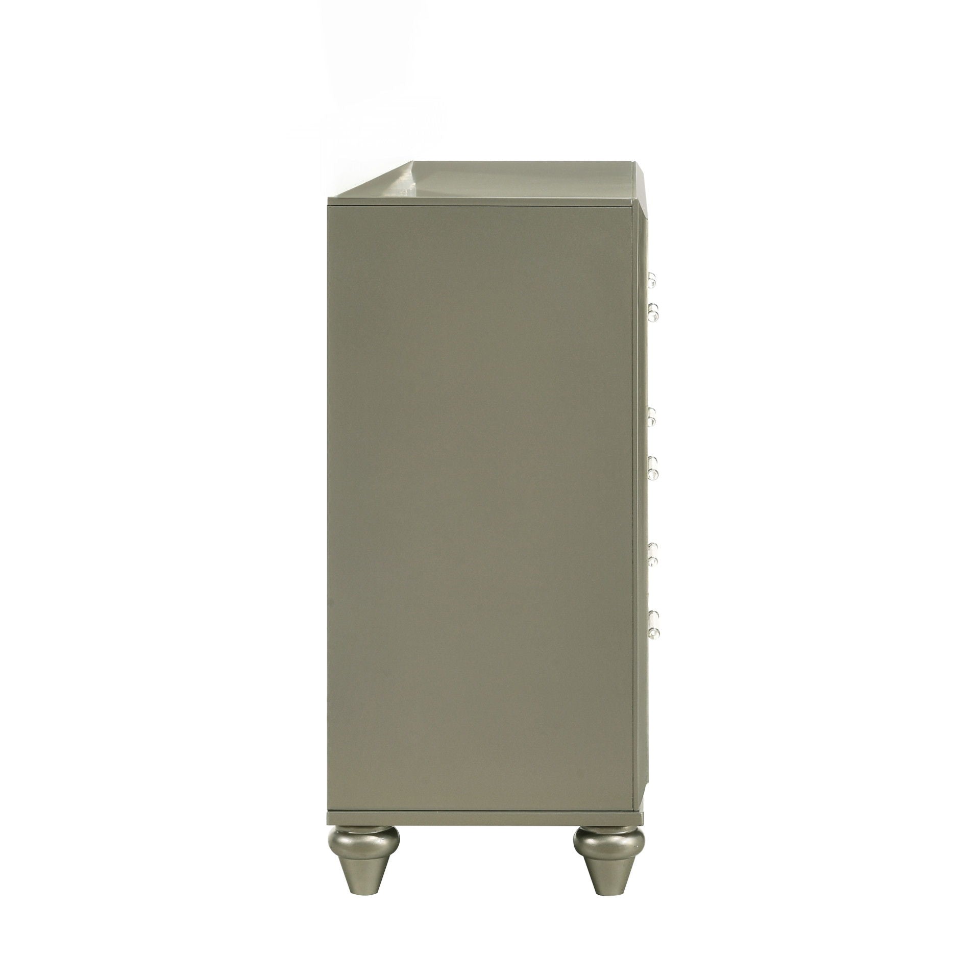 Meet the Lumina Dresser, a sturdy companion crafted from solid Rubberwood and durable manufactured wood, coated in an eco-friendly decorative laminate for enduring strength. Its sleek exterior boasts a high gloss gray finish, complemented by embossed silver laminate drawer fronts adorned with clear acrylic pulls, adding a touch of glam to any space. Inside, each drawer is meticulously constructed with English dovetail joinery, finished interiors, and full-extension glides for seamless functionality. With six spacious drawers, this dresser offers ample storage for all your clothing essentials. Experience the perfect blend of style and practicality with the Lumina Dresser, a reliable choice for your home.