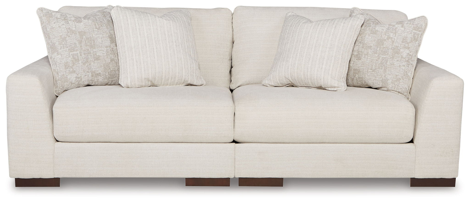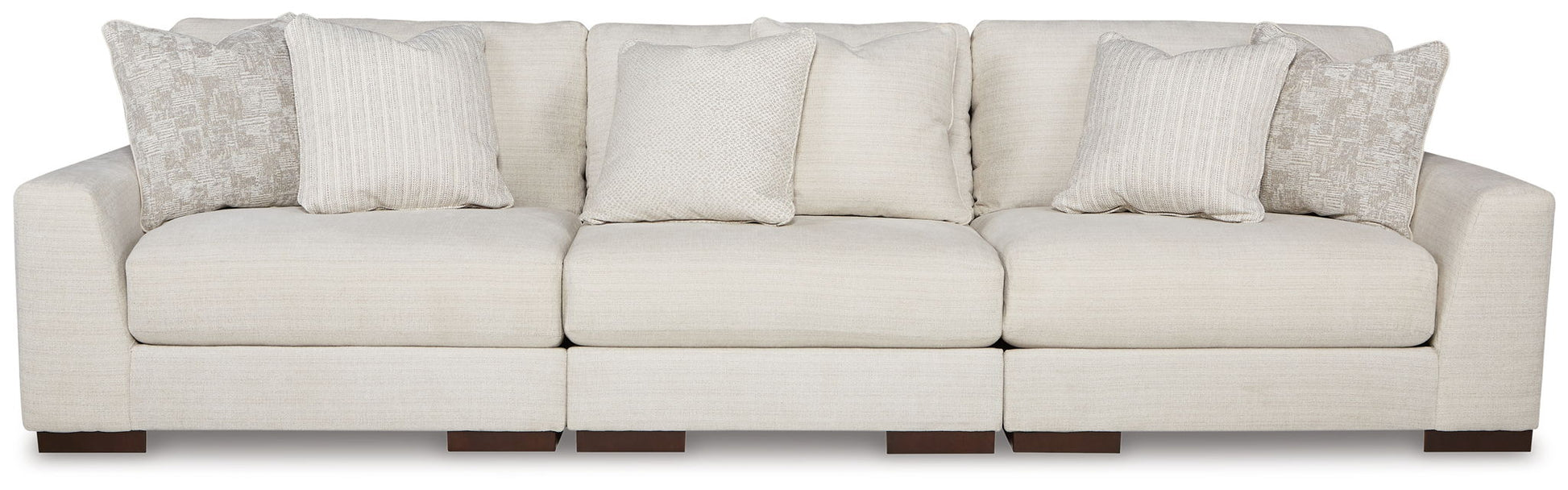 Distinguished yet unassuming, the versatile and visually appealing sectional adds a refined touch to any space. Inspired by the dapper look of fine tailored menswear, its rich texture turns heads, while a soft, neutral hue blends effortlessly with other colors in the room. Clean lines and wide track arms embrace a minimalist contemporary style. The sectional's modular design offers a variety of configurations for flexibility. Plush, reversible deep cushions provide extraordinary comfort and can be rotated for longer life. Accent pillows in soft shades of complementary colors add subtle contrast. This handsome piece will make a memorable impression again and again.