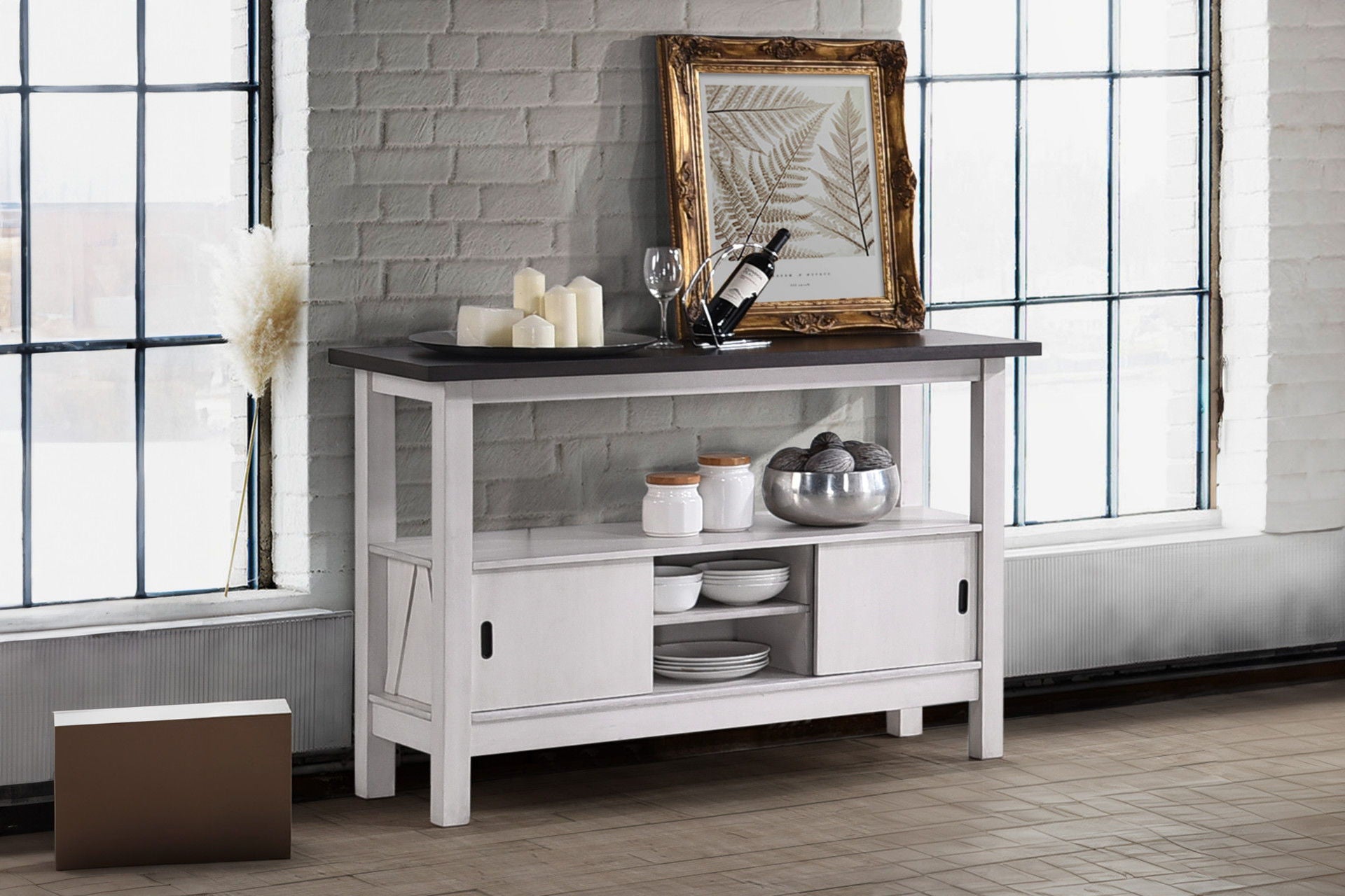 • Rustic, Farmhouse Finish: The Server has a dark brown top with a smooth finish, providing a modern contrast to the rustic design. The cabinet base is painted white and slightly distressed, enhancing the farmhouse appeal and adding character.