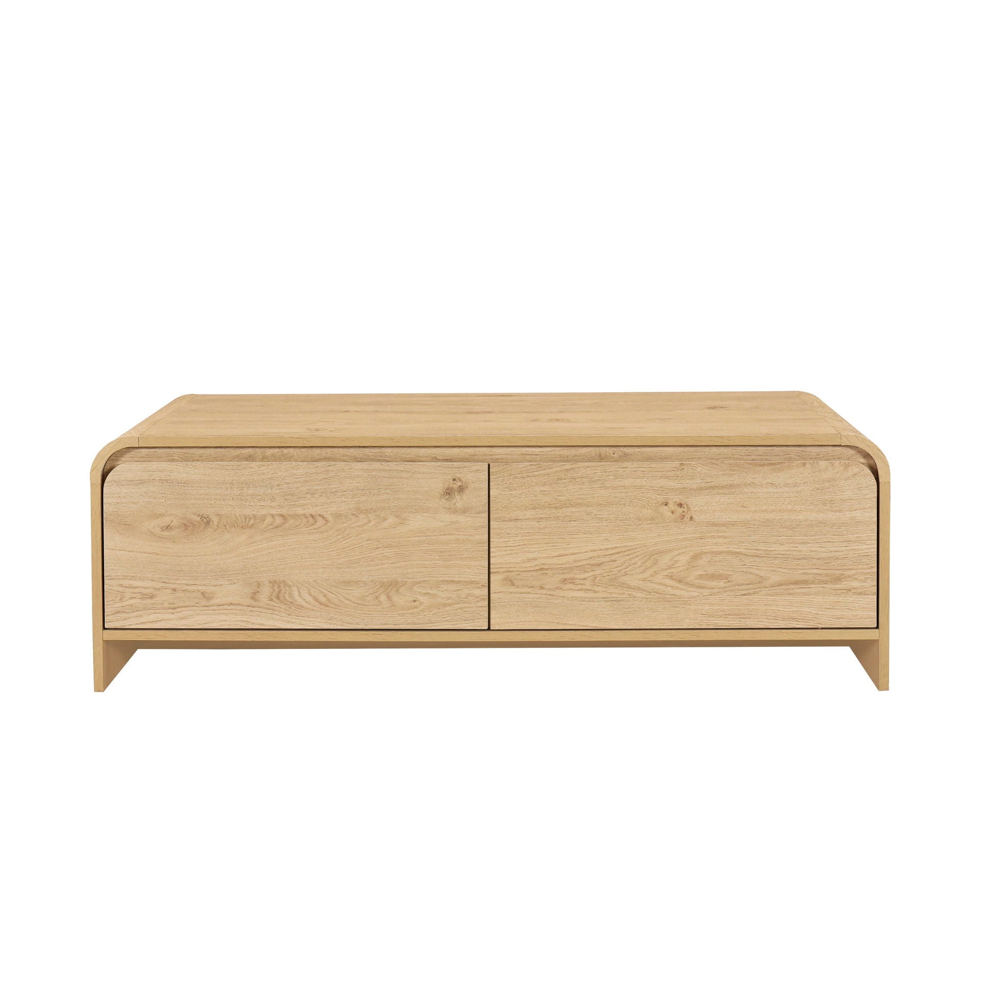 Discover the Mara Storage Cocktail Table, a blend of sturdy construction and eco-friendly materials. Crafted from durable manufactured wood and adorned with environmentally friendly laminate, this table boasts both sustainability and style. With its ample 47" surface area, it offers space for drinks and décor, while two spacious drawers provide convenient storage for reading materials and remotes. The minimalist design, accentuated by curved drawer fronts and waterfall-style tops and sides, lends a modern appeal to any room. Finished in a natural hue, it effortlessly complements a variety of décors, making it a versatile addition to your home. Experience functionality and elegance with the Mara Storage Cocktail Table.