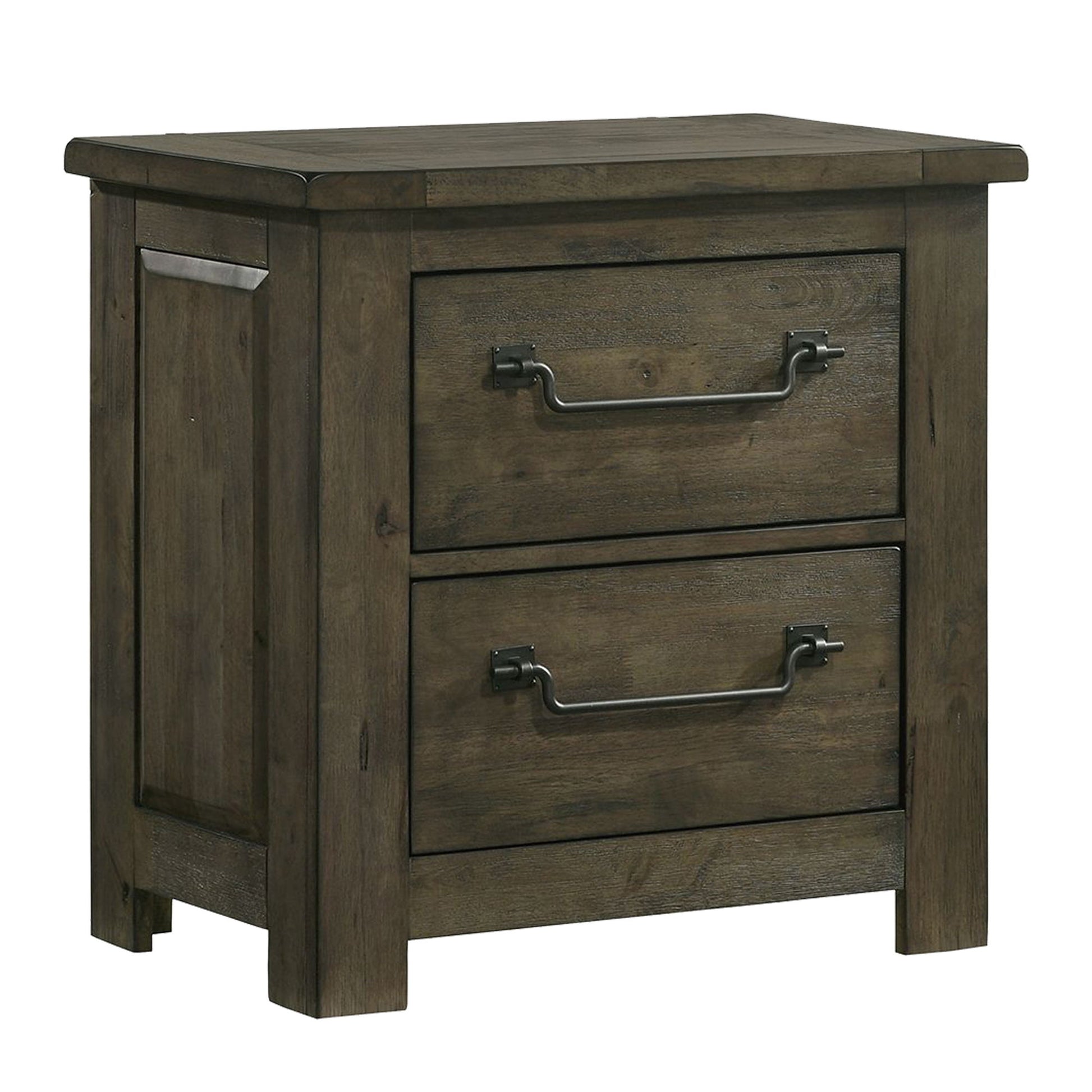 The Maverick 2-Drawer Nightstand in Grey delivers rustic and cozy style to your sleeping space. Features distressing and wood grain detailing throughout for that warm feel. Constructed of sturdy solid and manufactured woods for years of use. Includes a built-in USB outlet for charging your devices. Perfect neutral finish for adding to your existing bedroom aesthetic. Complete the look by adding the Maverick Panel Bed to your bedroom.