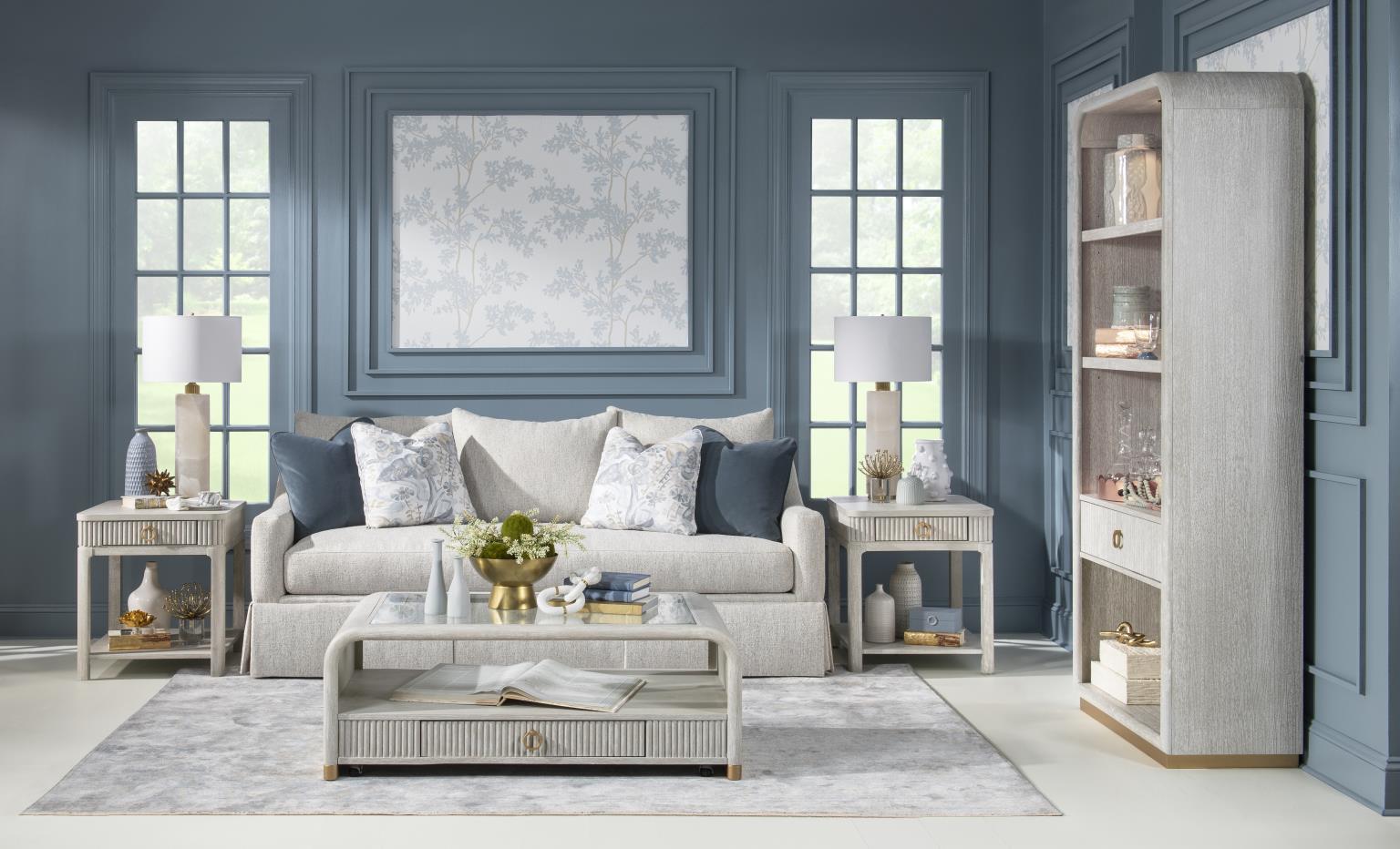 Approachable glamour. That's the look of the Miramar Total Home Collection from Legacy Classic - Modern. The collection features and acrylic accents bold fluting detail and waterfall edges. The accent finish is used in banding on case bases and foot rails table bases and on the posters of the Canopy Bed and low-post bed.