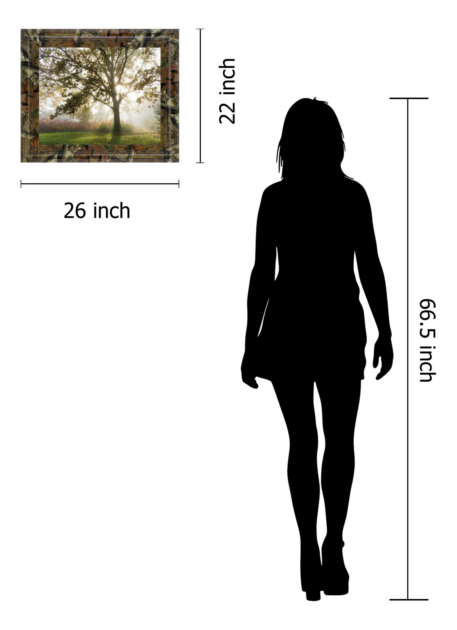 Step into a tranquil morning scene with this captivating framed photographic print, where the gentle sun peeks through the branches of a majestic tree. The soft light filters through autumn leaves, casting delicate shadows over a lush green meadow and rich foliage, inviting a sense of peace and renewal. Encased in a unique brown camo frame with crystal-clear glass, this artwork brings warmth and depth to any living room, bedroom, or office, making it a timeless reminder of nature's quiet beauty and the calm that comes with a new day.