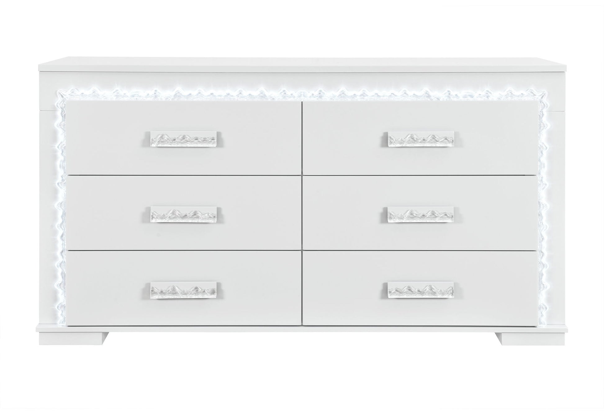 The Naomi Dresser blends beauty and practicality with its sleek light grey lacquer finish and LED light trim accenting the frame. Featuring multiple spacious drawers with full-extension glides, this dresser offers effortless storage and organization while enhancing the room's modern aesthetic.