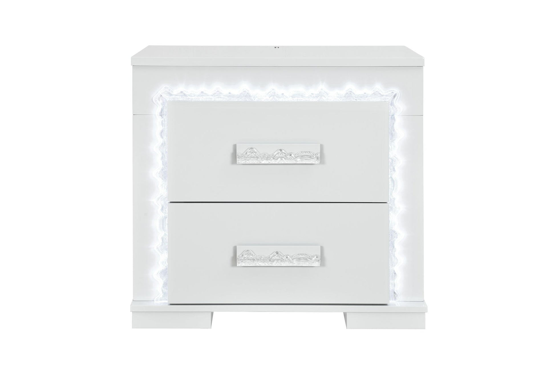 Keep essentials close at hand with the Naomi Nightstand, featuring a chic light grey lacquer finish, integrated LED lighting, and smooth-gliding drawers. Its modern design and soft glow create a relaxing bedside ambiance.