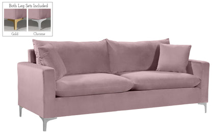 Curl up with a good book from the welcoming confines of this Naomi Sofa. The color of this sofa adds a bold touch to your decor and shakes up otherwise neutral color schemes. Plush velvet material feels cozy and comfortable against your skin, while deep seat cushions provide lots of room for you to stretch your legs. This sofa comes with both and legs, so you can customize its look to meet your decor plans. Pillows are included for added homey warmth and comfort.