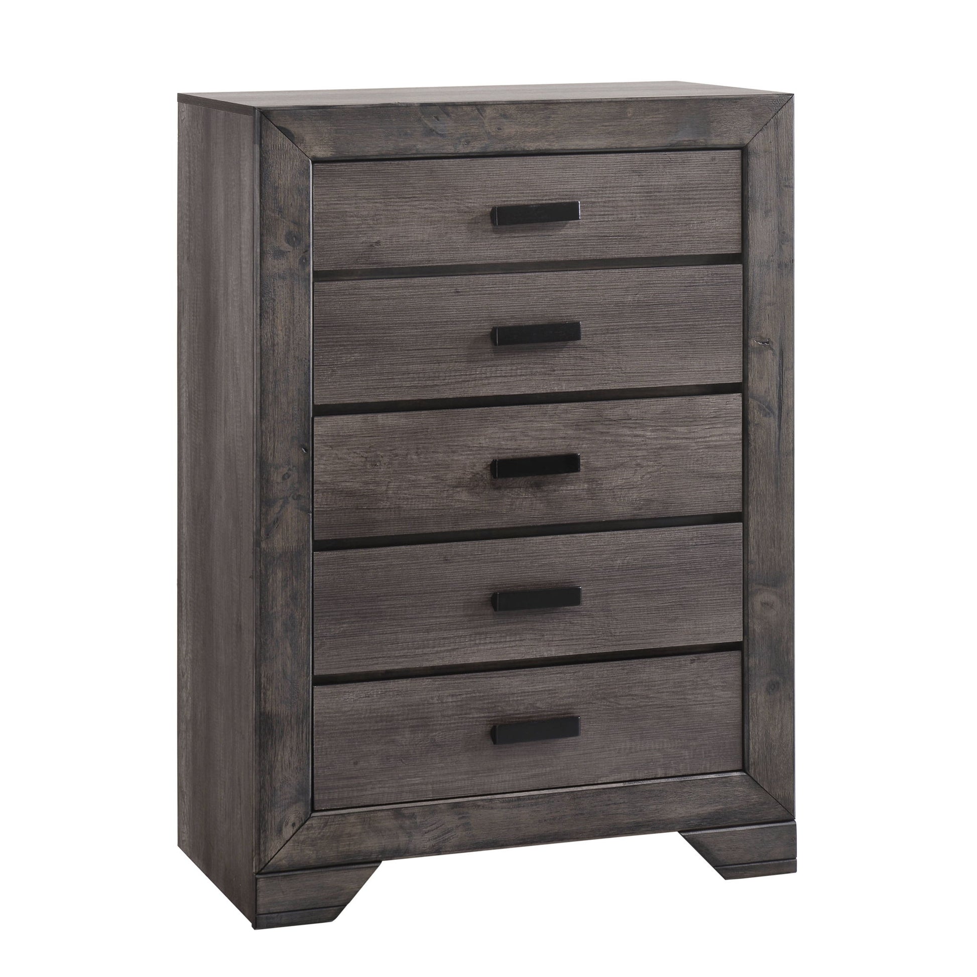 The Nathan 5-Drawer Chest is what rustic farmhouse dreams are made of! This vertical chest comes with five, spacious drawer; perfect for keeping all of your belongings neatly stored away. The top drawer is felt-lined and is a great spot to keep your more delicate items. The bottom drawer features a dust proofing layer to help protect your belongings. The weathered, gray oak finish pairs beautifully with the rustic metal drawer pulls. Sleek, clean lines and bracket feet complete the look of this rustic, chest of drawers.
