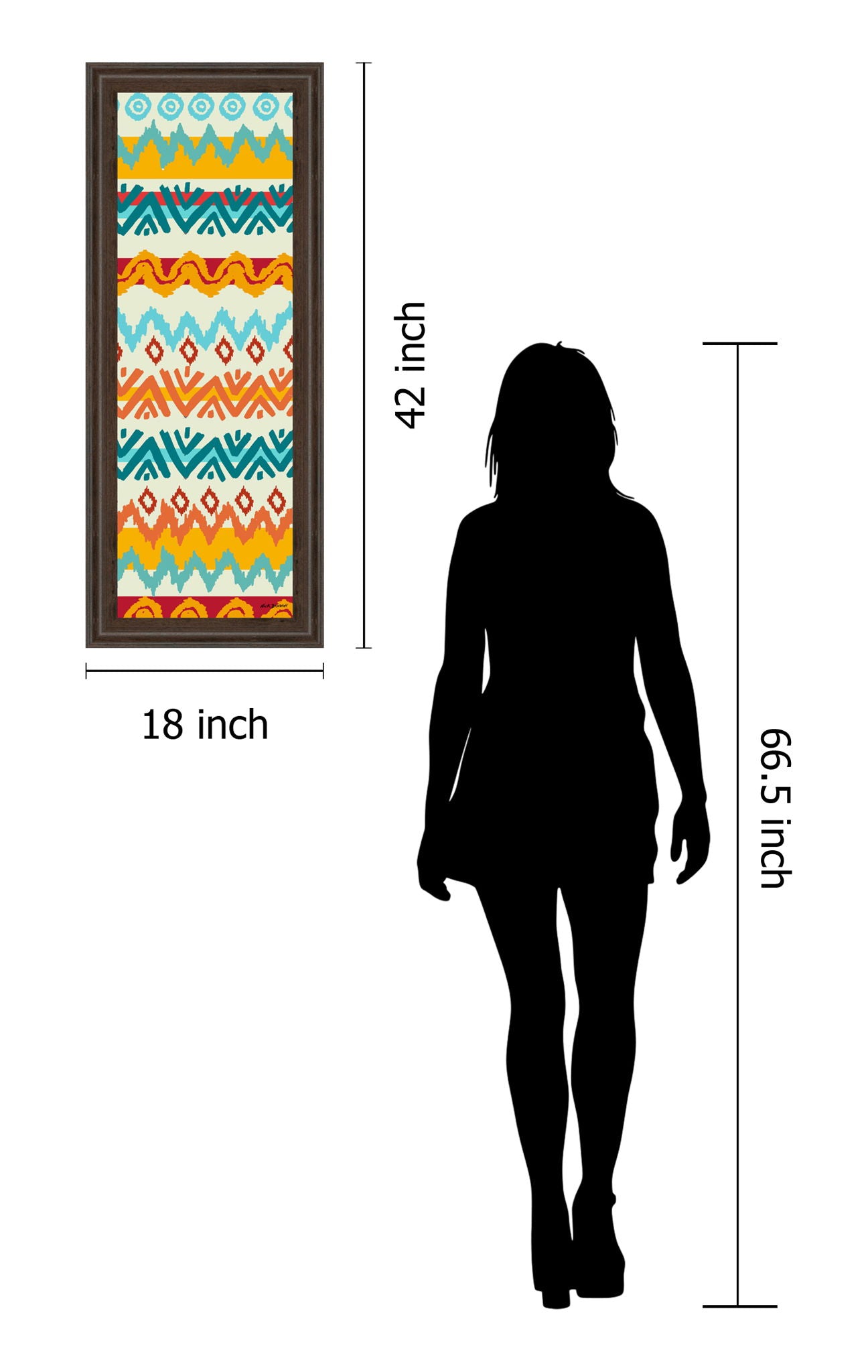 This framed wall art captures the vibrant spirit of Navajo-inspired patterns with bold, geometric designs in cream, teal, orange, red, yellow, brown, and blue hues. The rich cinnamon mocha MDF frame paired with premium real glass enhances the depth and vividness of the artwork, making it a striking focal point in any living room, office, or bedroom. Crafted in the USA and ready to hang, this 42 by 18-inch piece blends contemporary style with traditional motifs, bringing warmth and character to your space with expert craftsmanship and timeless appeal.