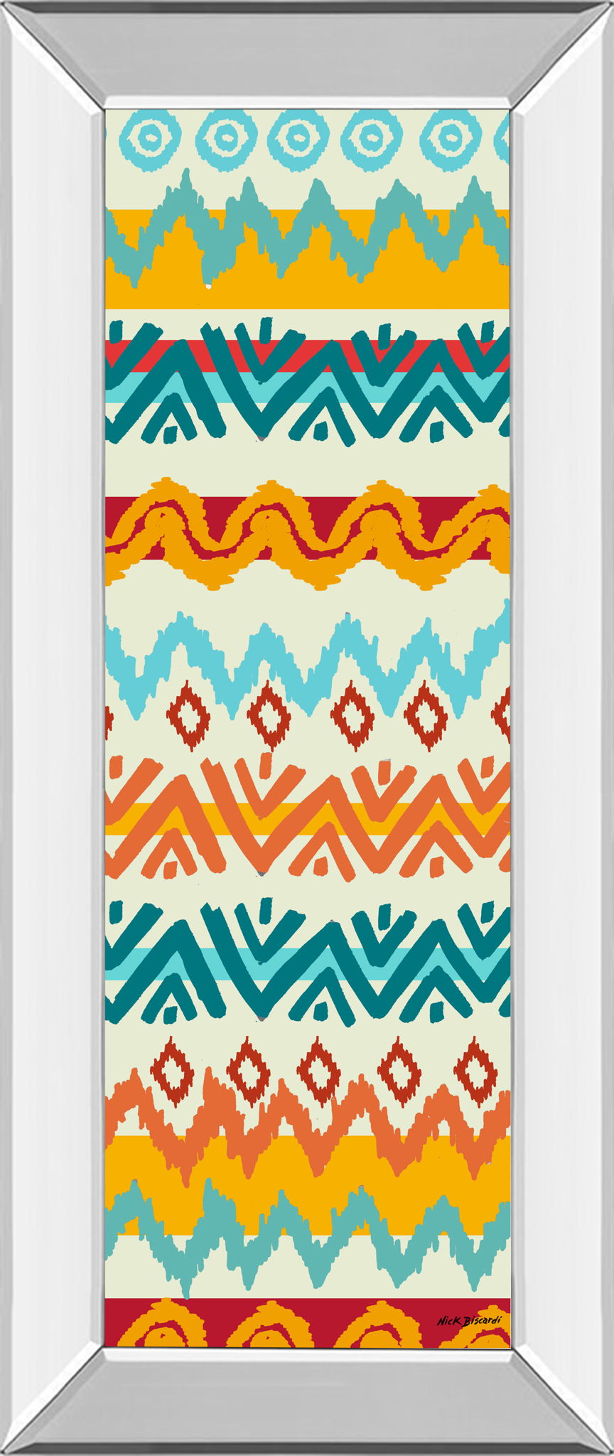 Infuse your space with the vibrant spirit of Navajo-inspired design through this striking framed wall art. The composition features bold, abstract geometric patterns in a lively palette of cream, teal, orange, red, yellow, and brown, creating a dynamic visual rhythm that commands attention. Encased in a sleek mirrored frame, the piece not only reflects light but also adds a touch of modern sophistication, enhancing the vivid colors and intricate details beneath premium real glass. Ready to hang and perfect for living rooms, bedrooms, or offices, this artwork blends cultural artistry with contemporary elegance, inviting warmth and energy into your décor.