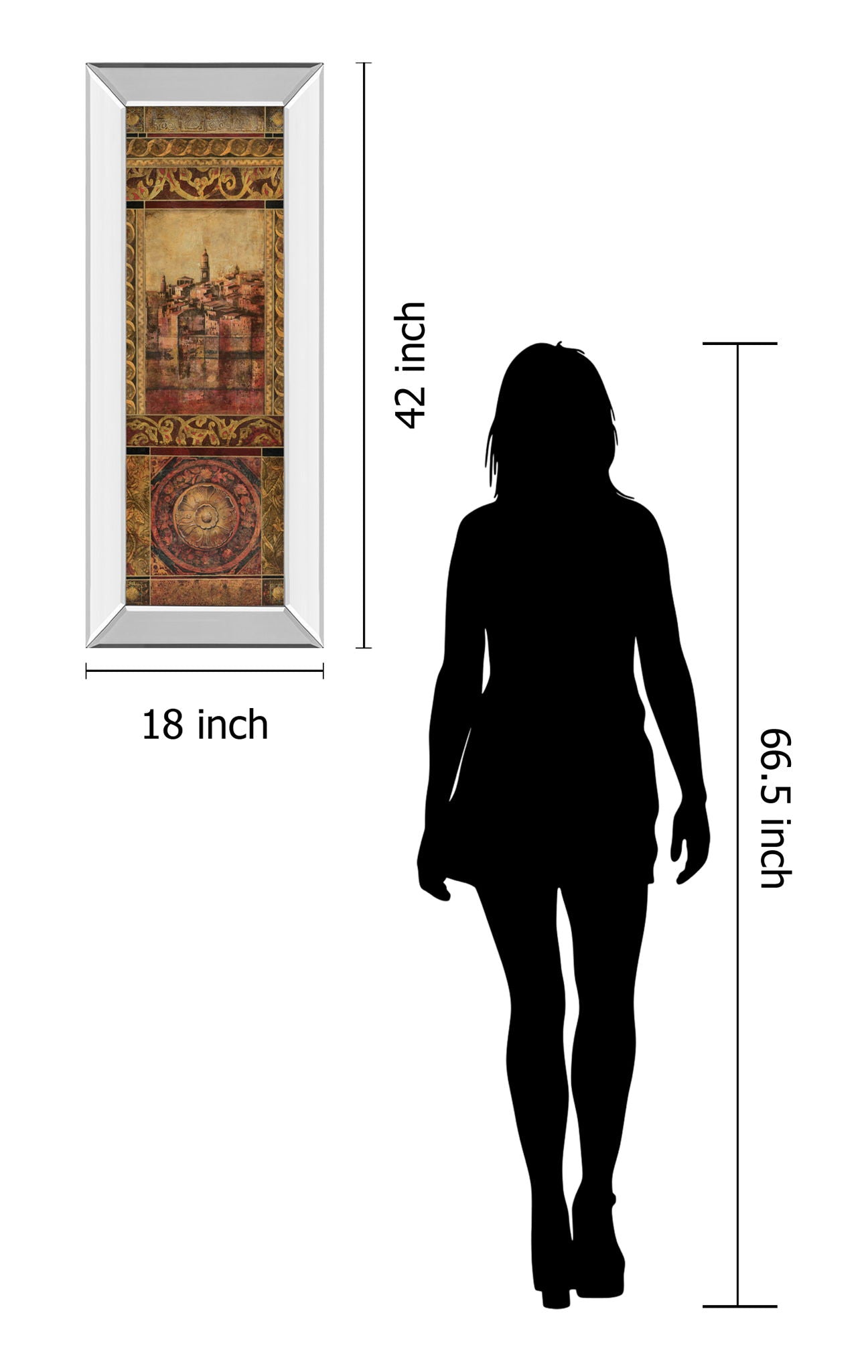 Step into a world where classic architecture meets rich artistry with this captivating framed wall art. The vertical composition showcases a timeless cityscape rendered in warm golds, browns, and reds, framed by intricate ornamental patterns that evoke a sense of history and elegance. Encased in a sleek mirrored frame, this piece reflects light beautifully, adding depth and sophistication to any living room or office. Crafted with mixed media on premium real glass, it offers both protection and a vibrant display of textures. Ready to hang, it invites you to bring a touch of traditional charm and refined beauty into your space.