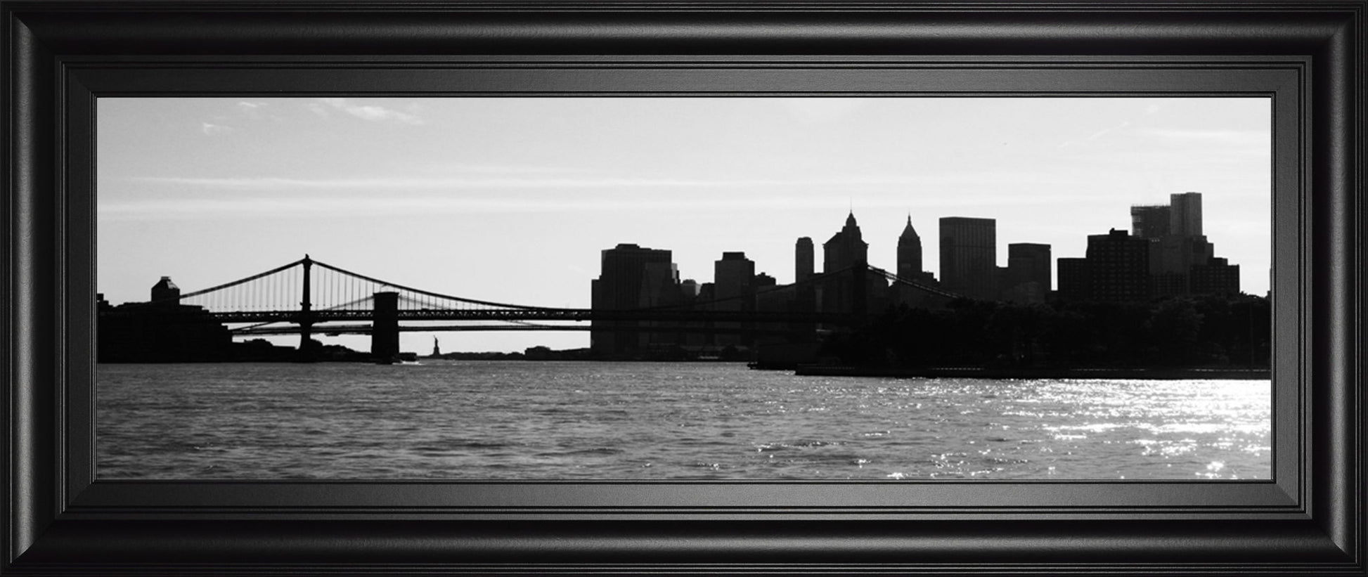 Step into the heart of the city with this captivating framed wall art that showcases a striking monochrome skyline. The image captures the iconic urban silhouette with a graceful balance of light and shadow, highlighting the architectural beauty of bridges and skyscrapers against a shimmering water backdrop. Housed in a sleek midnight aura frame with real glass, this piece not only protects the photograph but also enhances its depth and contrast. Perfect for adding a modern, sophisticated touch to your living room or office, this artwork invites you to experience the timeless energy and elegance of the metropolitan landscape from the comfort of your own space.