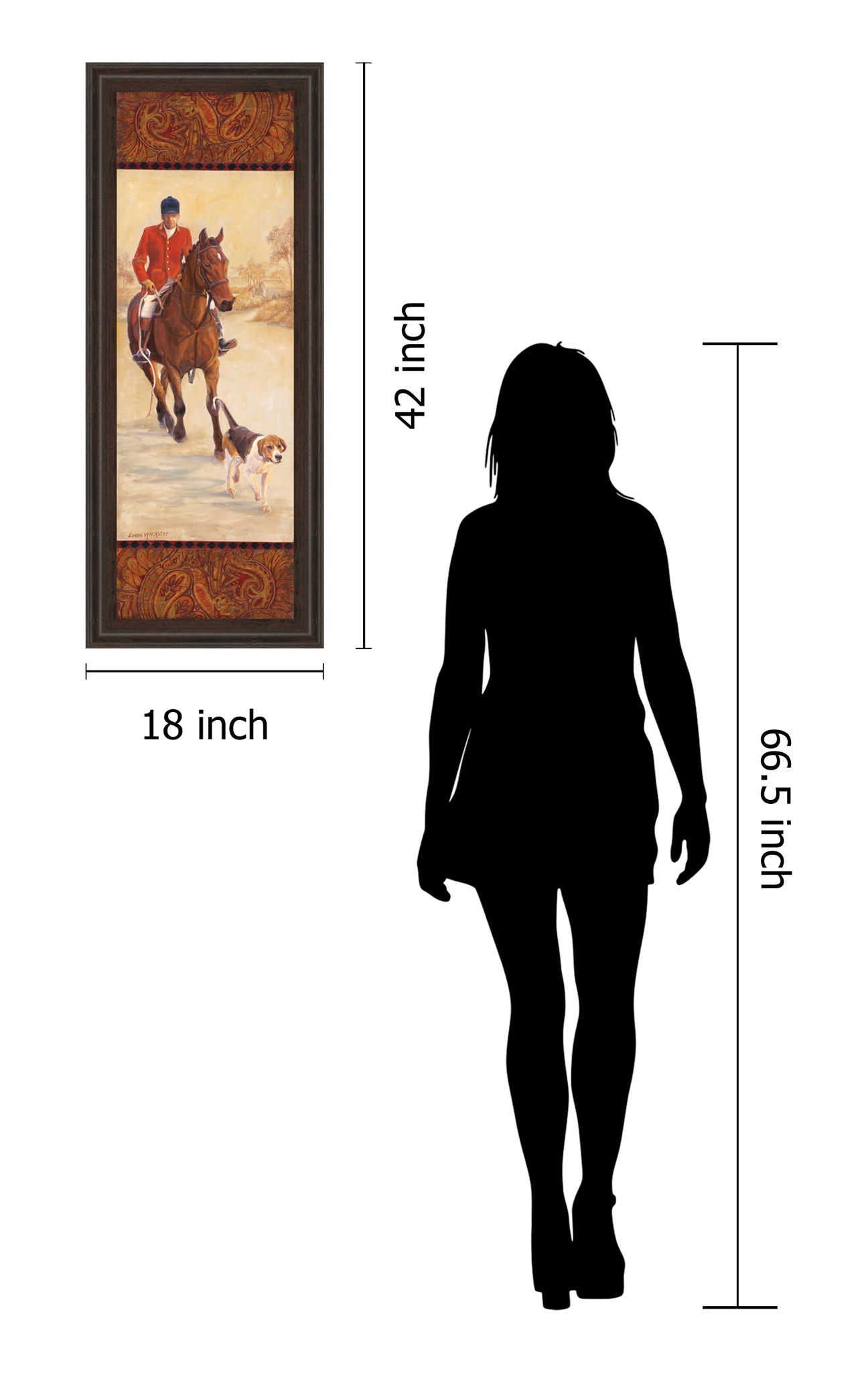 Step into a world where tradition and nature intertwine in perfect harmony. This evocative scene captures a rider dressed in classic hunting attire, confidently mounted on a noble horse, accompanied by a loyal hound leading the way. The warm, earthy palette of browns, reds, and creams, framed by intricate paisley patterns, invites you to experience a timeless moment of companionship and rustic charm. Crafted with a cinnamon mocha frame and real glass, this oil painting is as durable as it is elegant, ready to enhance the ambiance of your living room, office, or den with a touch of heritage and sophistication.