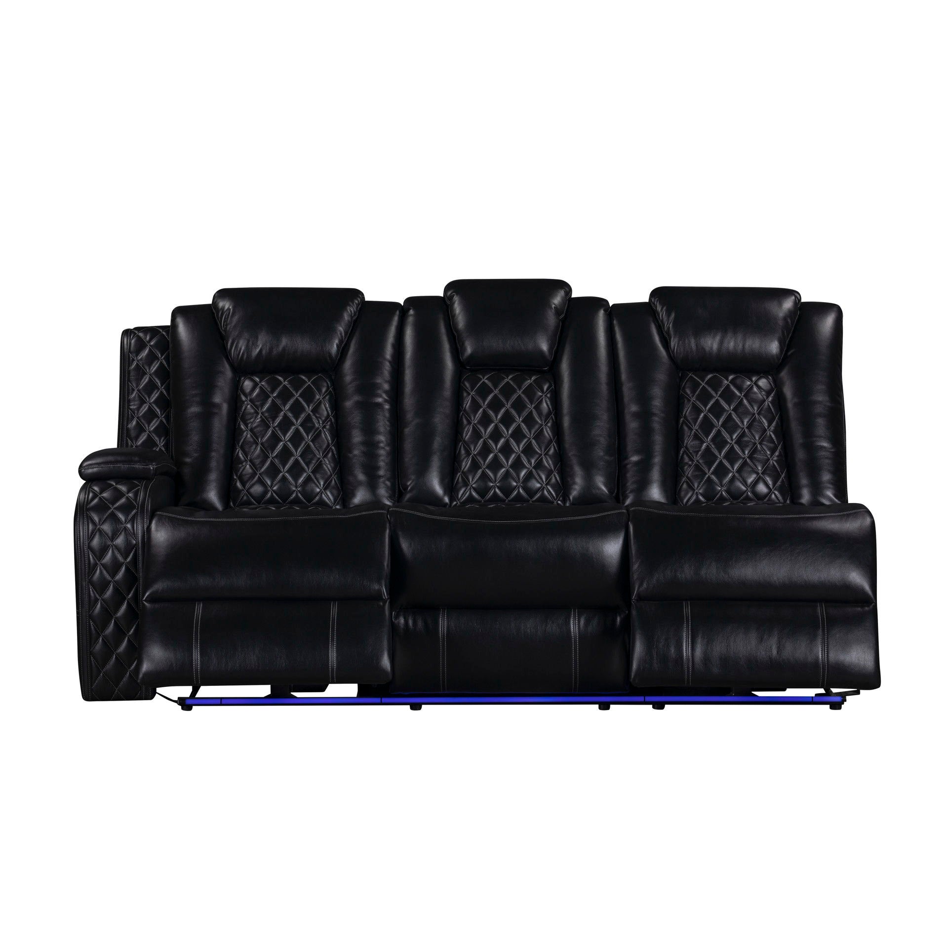The Orion II 3-Piece Power Motion Sectional with 3 Recliners and Adjustable Headrests in black is the ultimate blend of style, comfort, and functionality. This set includes a Left Arm Facing Power Sofa with 2 recliners, a Right Arm Facing Power Console Loveseat with 1 recliner, and a Wedge, all built with a combination of premium hardwoods and high-quality manufactured wood for exceptional durability and longevity. The luxurious black upholstery, crafted from 80% polyester and 20% synthetic leather, offers a supple feel and comfortable seating. Effortless reclining mechanisms support up to 350 pounds, allowing you to lay back and relax in your favorite position, with headrest and footrest adjustments available at the touch of a button for optimal comfort. Experience unparalleled comfort with high-density foam and pocket coil cushions wrapped in Dacron polyester, ensuring both support and luxury. The sleek design features expert tailoring, with white contrast stitching that highlights the distinctive diamond pattern on the seats and arms, along with plush-wrapped headrests and track arms for added luxury. The contemporary design includes lift-up pillowed arms revealing convenient storage compartments, a sofa center back cushion that folds down to access two cupholders and a snack tray, and a loveseat center console with a storage cubby and two silver drink holders, seamlessly blending style and practical functionality. Enhance your home cinema setup with theater lighting accenting the base of both the sectional sofa and loveseat, immersive stereo sound from Bluetooth speakers, and convenient wireless charging pads and USB charging ports to keep your devices powered. Additional features include reading lamps under the center sofa headrest and a drop-down center back cushion housing two wireless charging pads. The ORION II sectional is the perfect addition to any living space, offering a luxurious and practical seating solution.