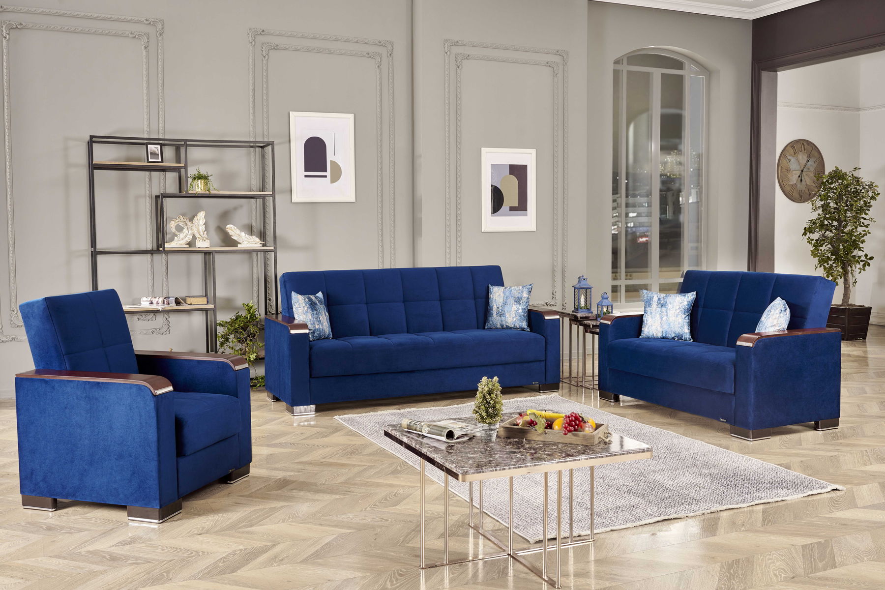 Ottomanson Armada X - Upholstered Convertible Wood Trimmed Loveseat With Storage - Blue Microfiber