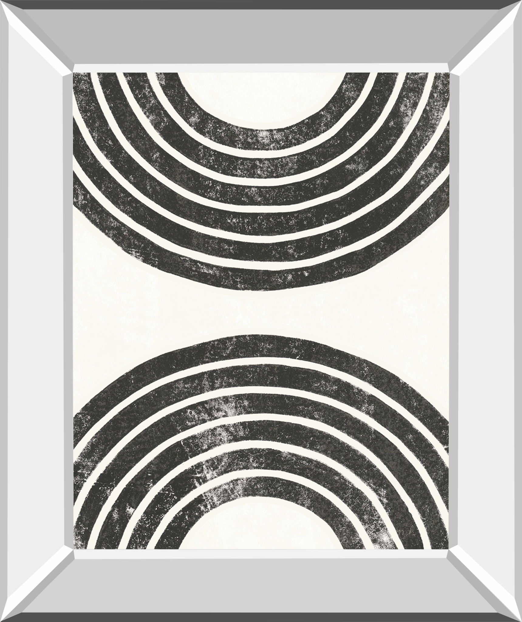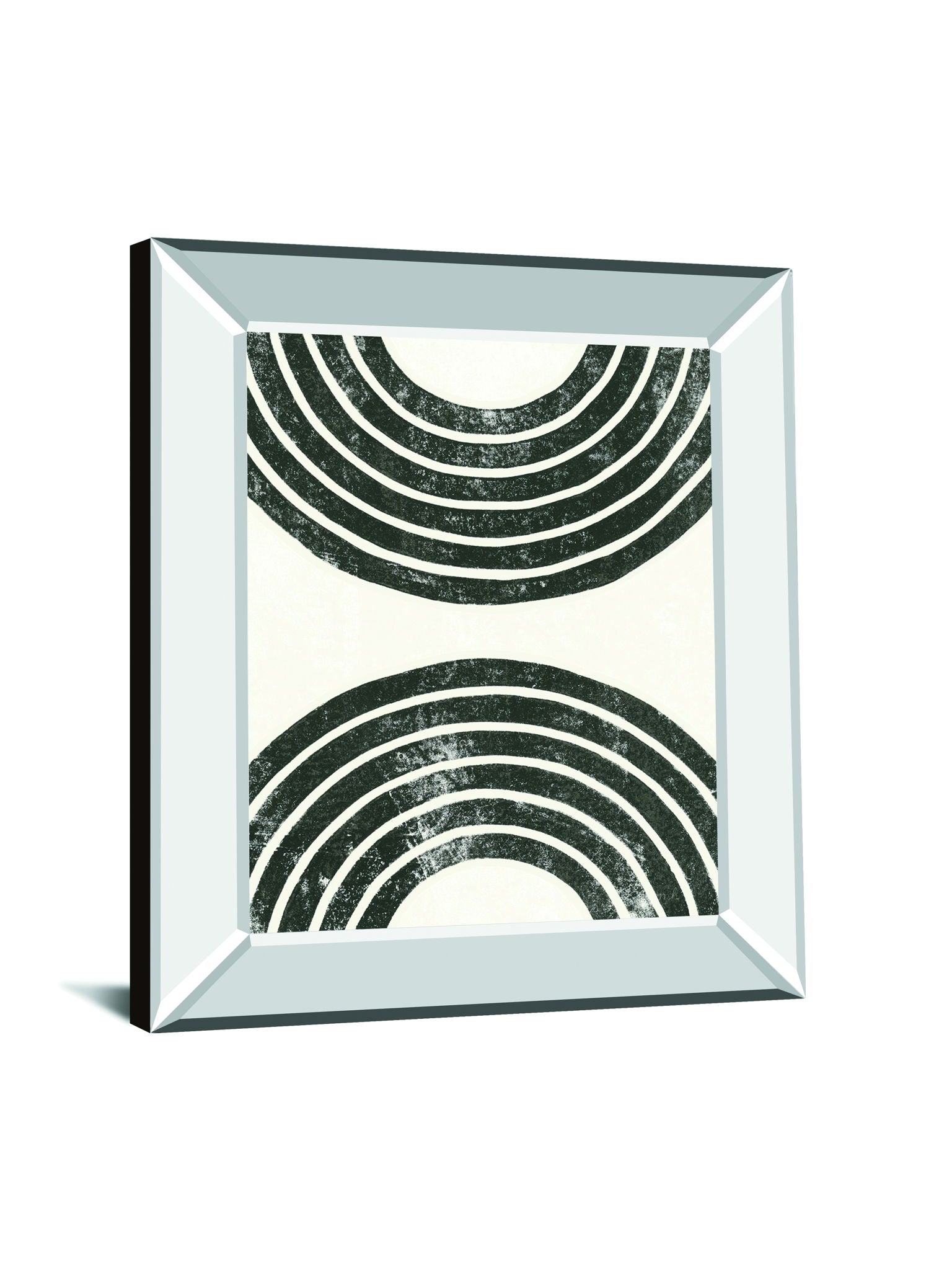 Discover the subtle power of simplicity with this striking abstract wall art, where bold black semi-circular arcs rest gracefully against a soft white backdrop. Encased in a sleek mirrored frame, the piece brings a modern edge and a touch of luxury to any room. Crafted with premium real glass, it offers crystal-clear protection that enhances every detail and contrast, making it a perfect statement for living rooms, bedrooms, or offices. Ready to hang and proudly made in the USA, this artwork effortlessly elevates your space with contemporary sophistication and timeless appeal.