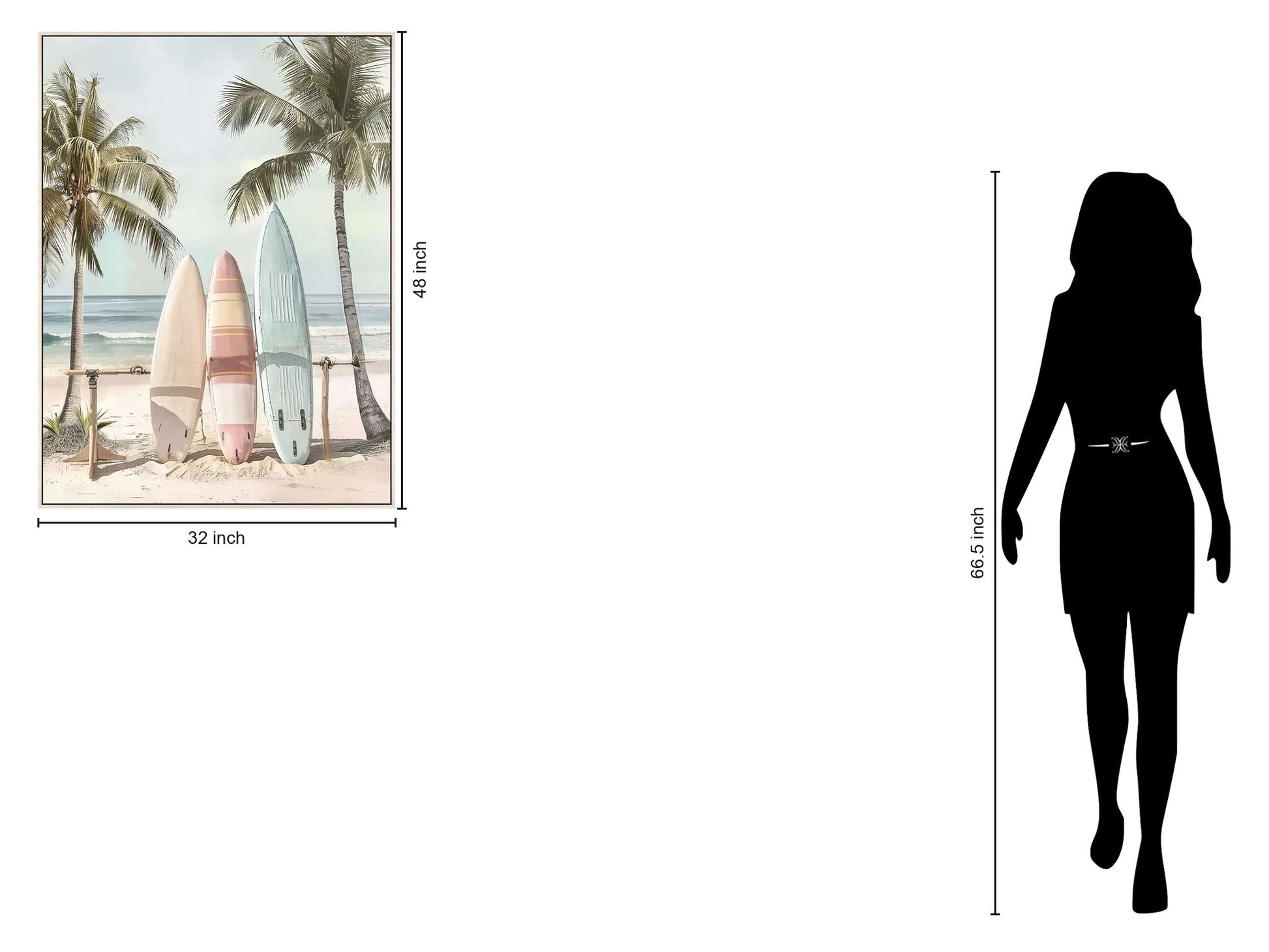 “Surfside” captures the serene beauty of a coastal morning with three surfboards resting against a makeshift rack between palm trees. This hand-painted oil canvas evokes a peaceful beachside vibe, blending soft pastels and natural tones to bring a sense of calm and adventure to your space. Perfectly framed in light beige polystyrene, it arrives ready to hang, making it an effortless addition to any living room or coastal home. Each purchase supports a social cause, donating a meal to a hungry American child, adding heart to this artful escape.