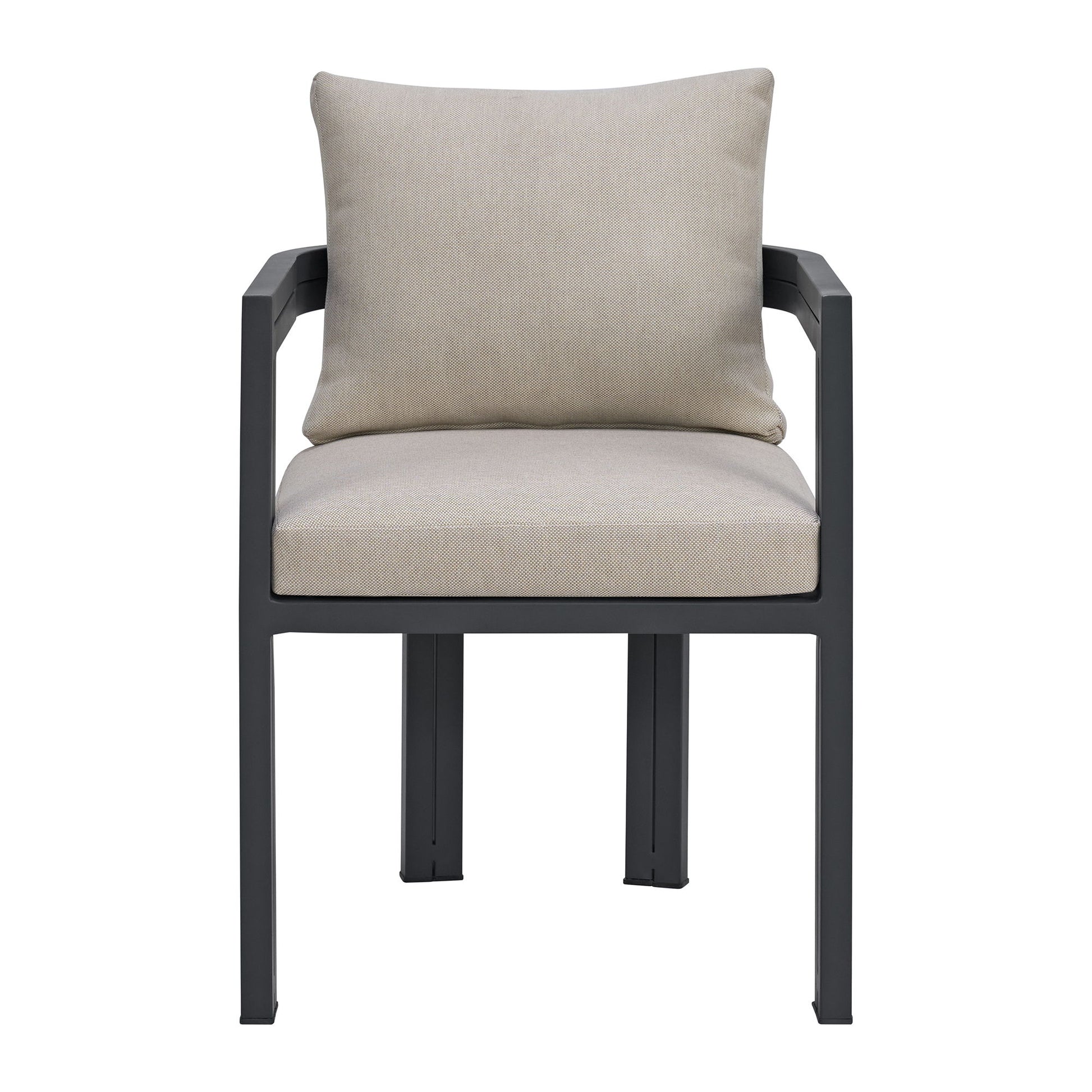 Dine in comfort with the sleek simplicity of the Playa Dining Chair. Built with durability in mind, this piece features quality materials optimal for outdoor use, like aluminum framing and weather-resistant olefin upholstery. Detachable cushions with memory foam ease maintenance while simultaneously forming clean lines with their streamlined knife-edges. Angular open armrests create a refined, modern look and enhance moments of repose for your guests. For a modern and refined update to your outdoor area, the Playa Dining Chair delivers in both durability and style.