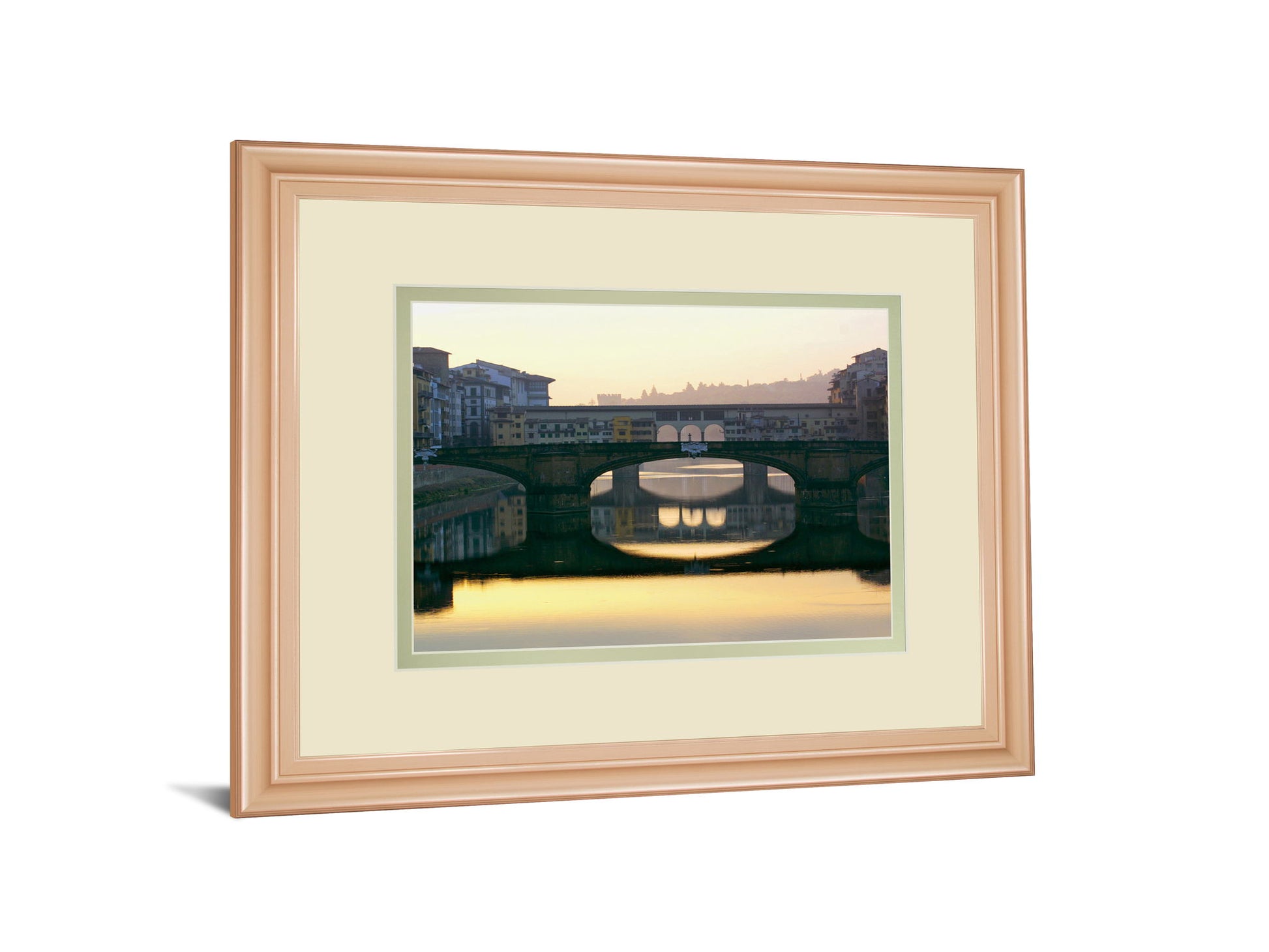 Step into the serene charm of Florence with this captivating depiction of a historic bridge at dawn. The soft, warm hues of the early morning light dance across the water, creating a mirror-like reflection that draws you into a moment of peaceful stillness. Framed in a delicate rose gold finish with double matting in cream and sage, this piece blends architectural elegance with a gentle color palette, making it a perfect addition to any living room or office. Its premium glass protection ensures every detail remains vivid, inviting you to experience the timeless beauty of a classic European landmark from the comfort of your space.