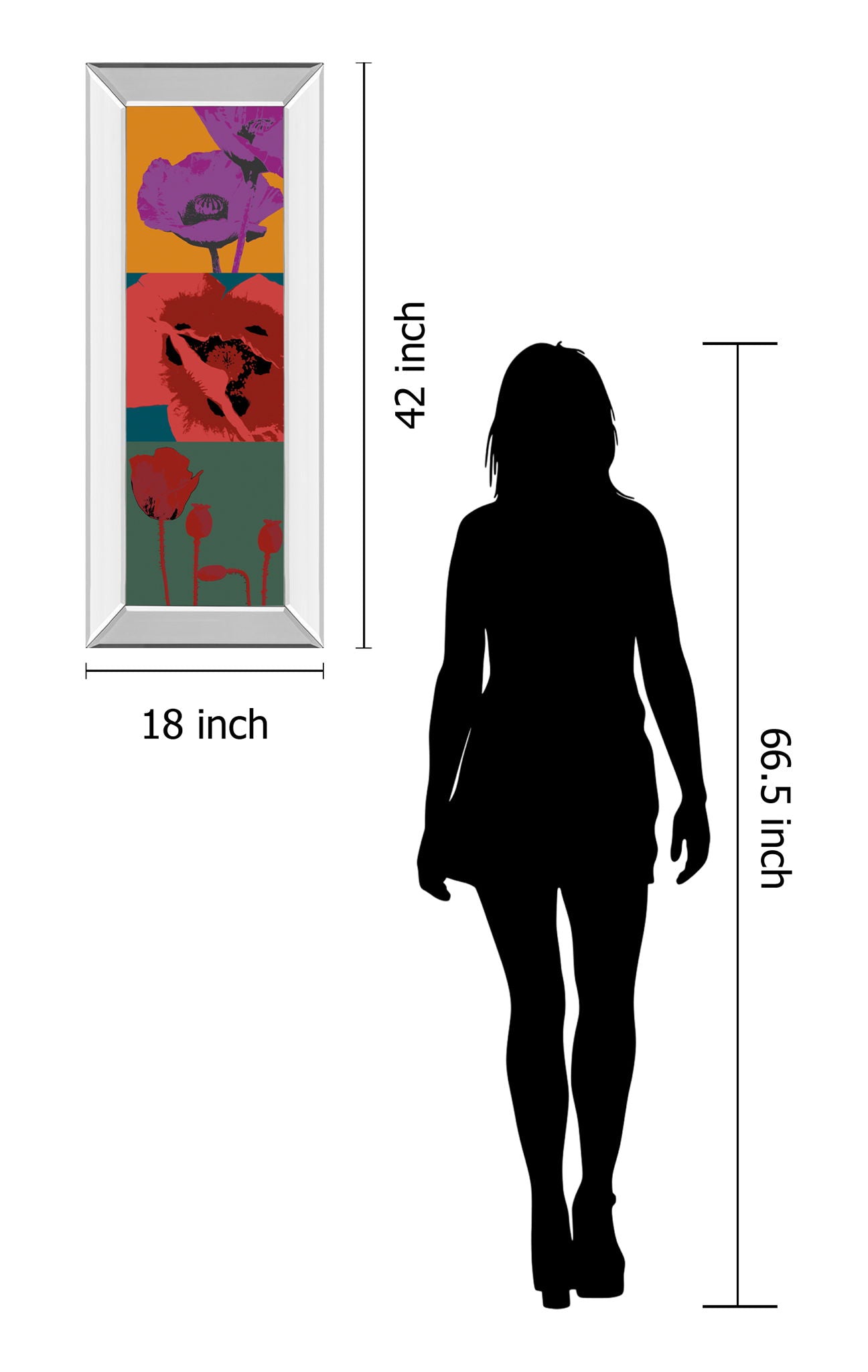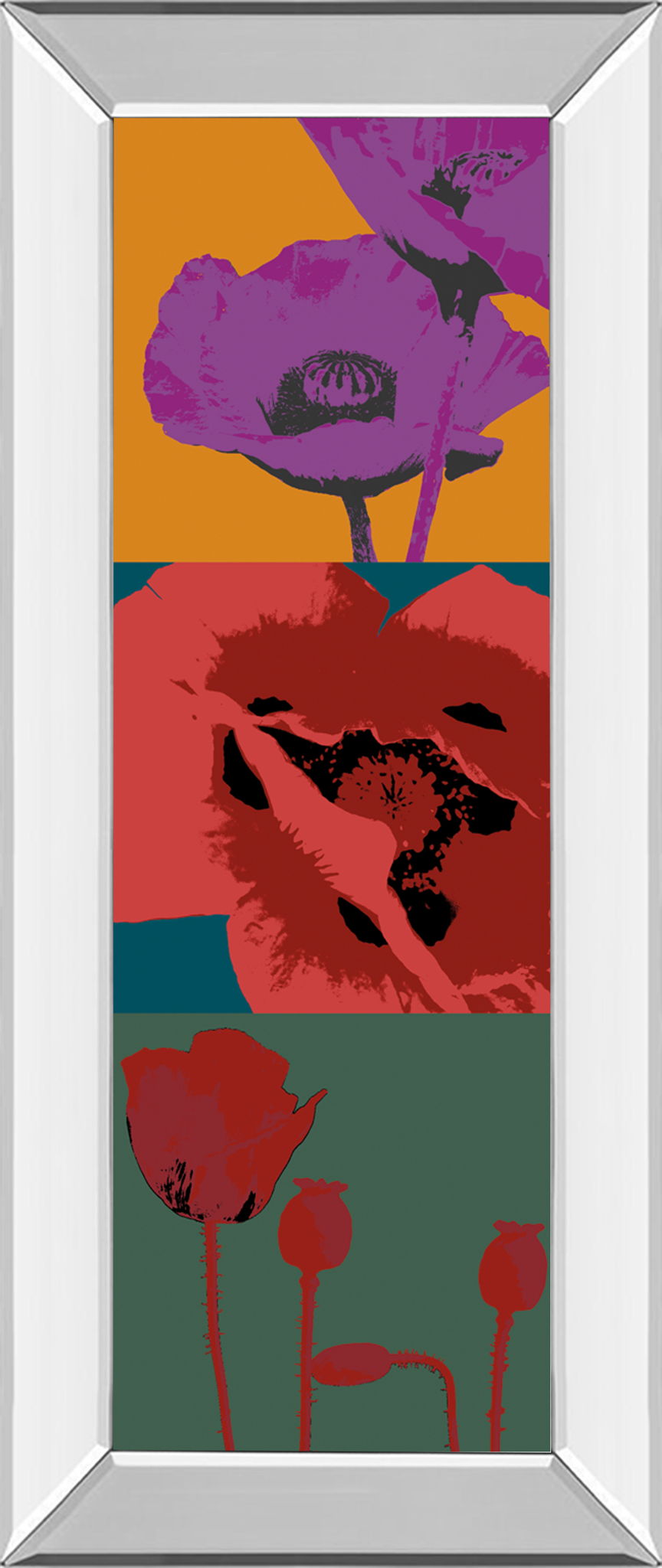 This vibrant framed wall art captures the bold beauty of poppies in a contemporary style that enlivens any space. Rich purples, reds, and oranges contrast strikingly against teal and green backgrounds, creating a dynamic botanical composition that draws the eye. Encased in a sleek mirrored frame with real glass, this piece adds depth and elegance to living rooms, bedrooms, or offices. Ready to hang and crafted with care, it’s a sophisticated way to bring color and modern floral charm into your home.