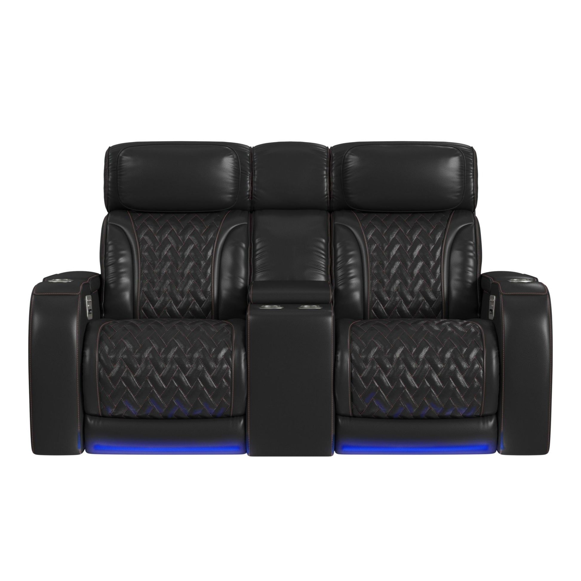Upgrade your living room’s décor with the Prime Time Loveseat. The power recline, headrest, and lumbar function maximize comfort, allowing you to enhance your moments of repose. Features like LED lighting add modern flair, while wireless charging, metal cupholders, and hidden storage in the armrests and console add practical convenience. Luxurious 100% leather upholstery in a versatile black finish makes this piece easy to pair with various décor styles and color palettes, and supportive pocket coil seating with foam cushioning creates a cozy retreat. For a refined addition of style and comfort, the Prime Time Loveseat is a clear choice.