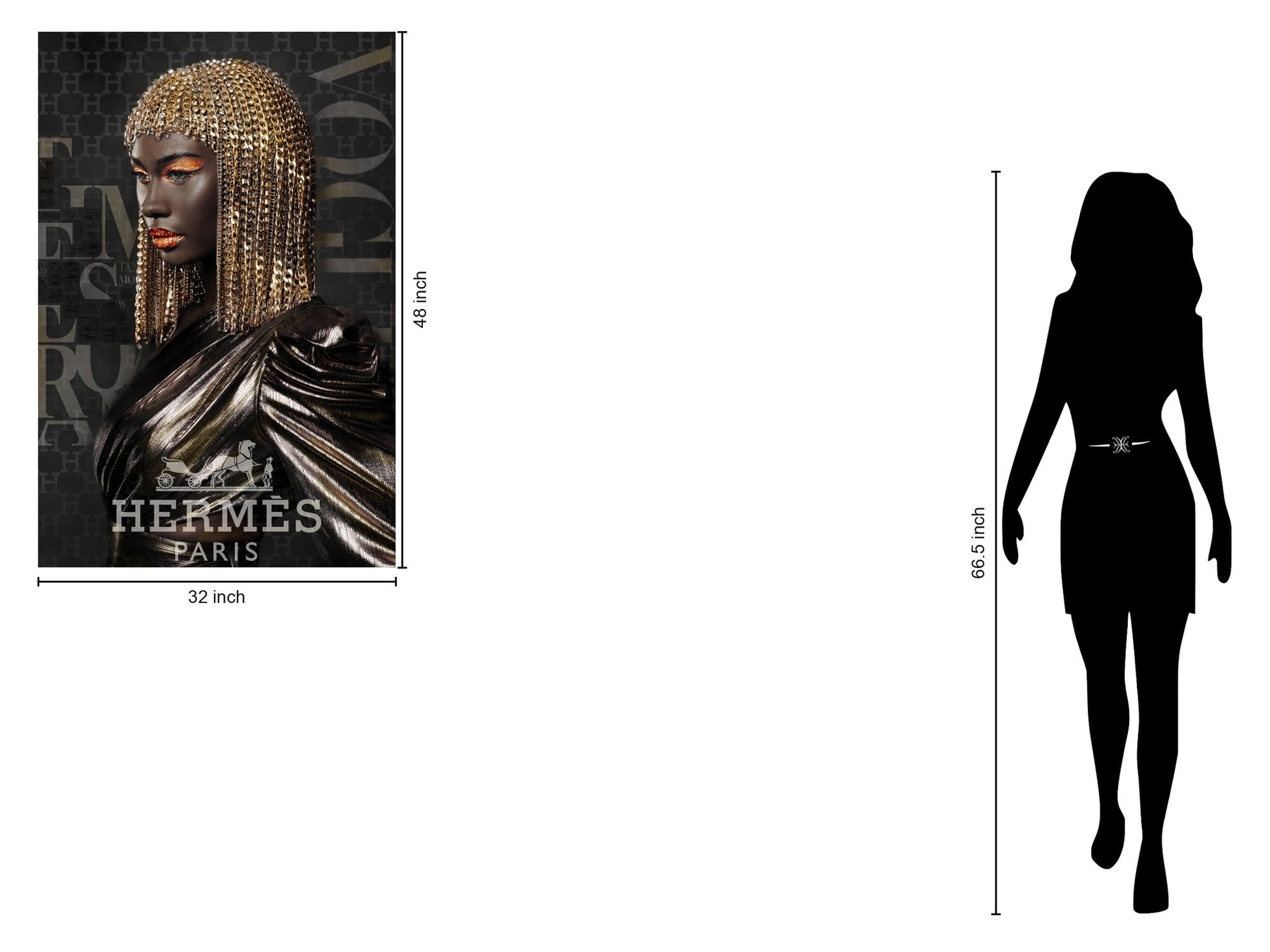This striking contemporary wall art titled "Golden Statement Chains Canvas" captures a powerful portrait of elegance and boldness. Featuring a figure adorned with shimmering gold chains and radiant metallic textures, the piece blends graphic artistry with hand-applied accents to create a dynamic and sophisticated visual experience. The high-gloss canvas finish enhances the depth and brilliance of the colors, making it a captivating centerpiece for living rooms, offices, or bedrooms. Ready to hang with professional mounting hardware, this artwork brings a luxurious and dramatic flair to any modern space.