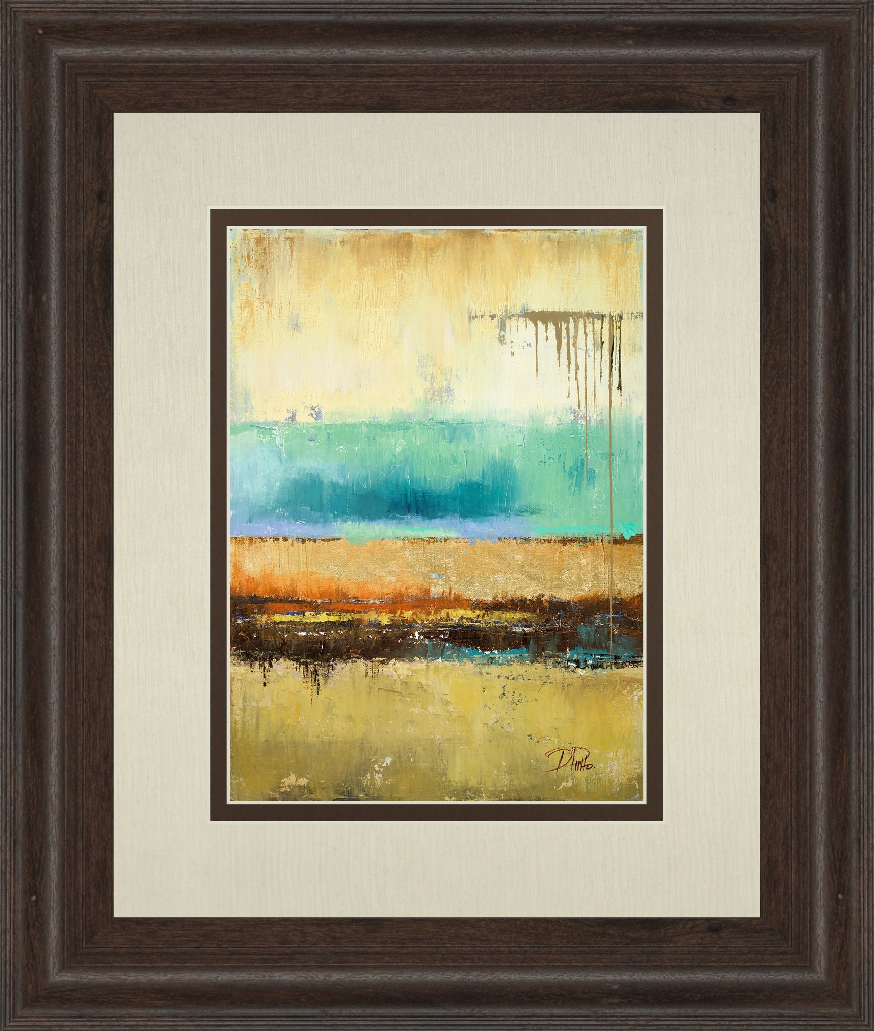 Immerse yourself in the tranquil beauty of this abstract mixed media piece, where soft yellows, turquoise, and warm earthy tones blend seamlessly to evoke a sense of calm and contemplation. The textured layers and subtle drips create a dynamic visual story that invites you to explore its depth and emotion. Encased in a rich cinnamon mocha frame with double matting and protected by premium real glass, this artwork offers a polished, gallery-style finish that enhances any living room or modern space with a touch of sophisticated elegance.
