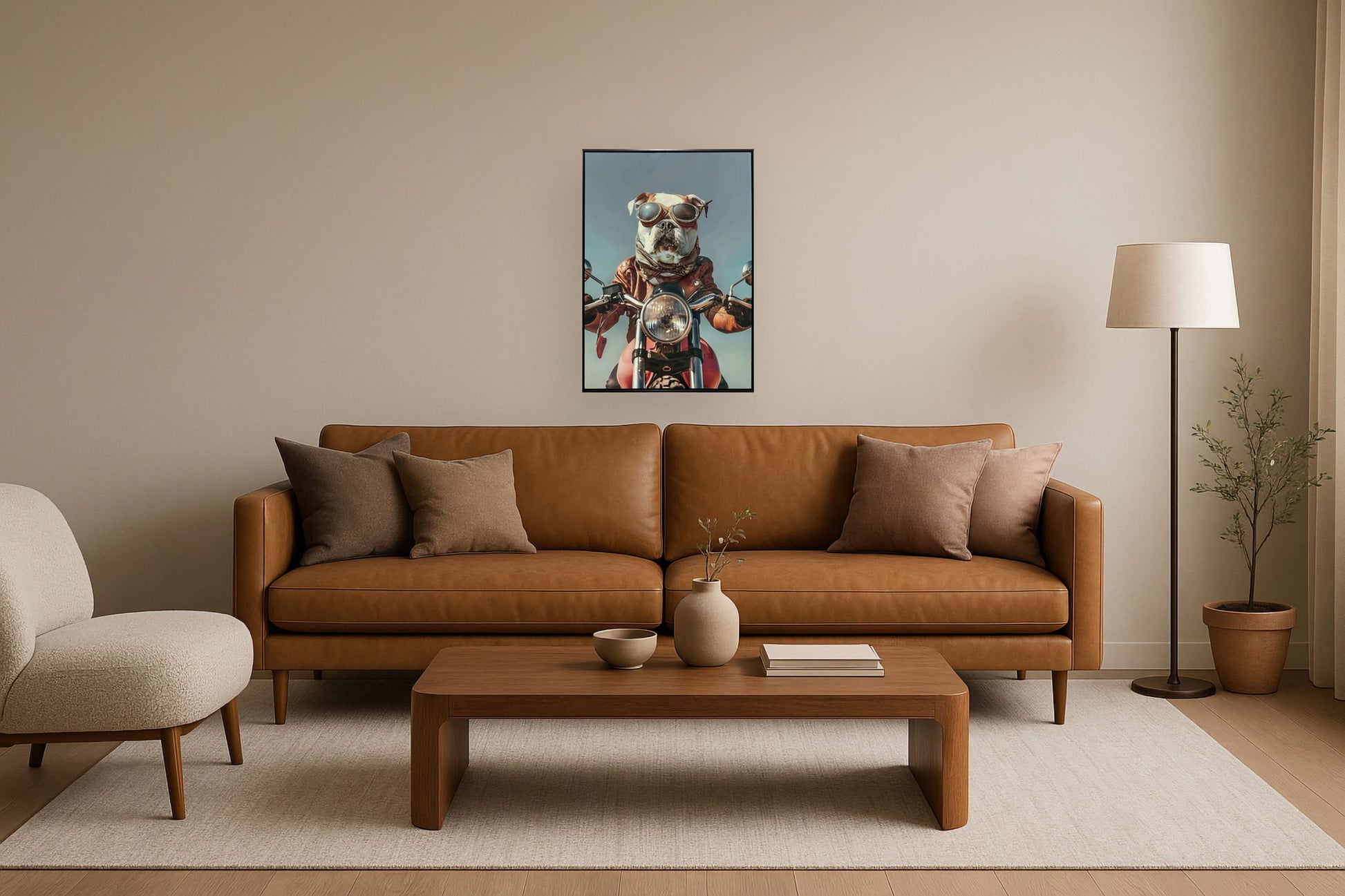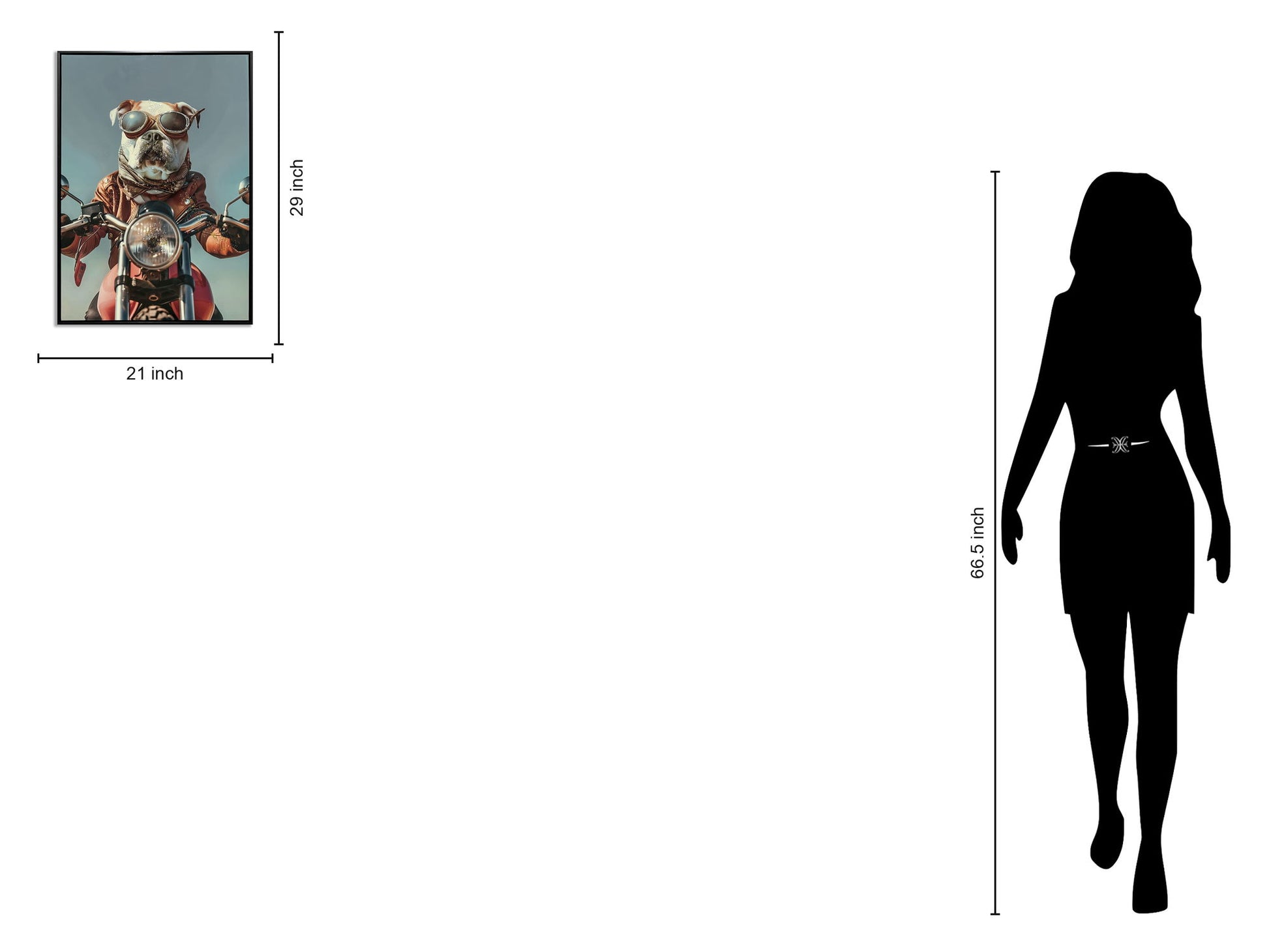 Experience a playful fusion of whimsy and style with "Dog on Motorcycle," a captivating graphic art piece printed on durable gloss canvas. This contemporary artwork features a charming dog sporting aviator goggles and a leather jacket, riding a motorcycle against a serene blue sky. Hand-applied accents add texture and depth, making each piece truly unique. Set within a sleek black polystyrene frame, this ready-to-hang wall art brings personality and a touch of humor to living rooms, offices, or dens. Its glossy finish enhances colors and light, creating a vibrant focal point that sparks conversation and joy.