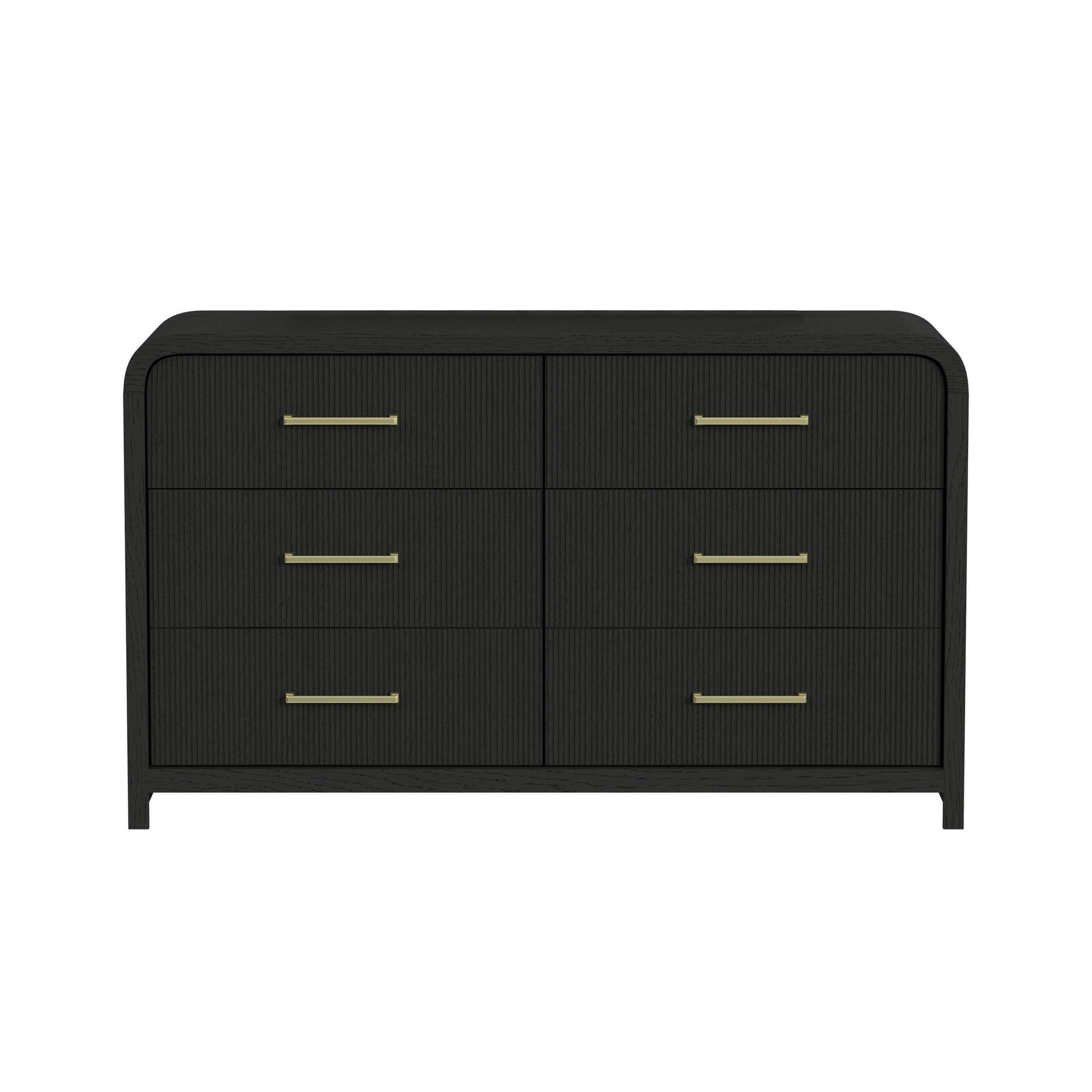 Enhance your bedroom with the stylish Ridgemont Dresser. Finished in a light wood with natural grain detailing, this piece brings warmth and elegance to any space. Sleek, rounded edges and vertical reeding throughout create a modern yet refined aesthetic. The dresser features a black felt-lined top drawer, providing protection and organization for your essentials. Spacious drawers, accented with bold black bar pulls, offer ample storage. With clean, minimalist lines, the Ridgemont Dresser combines function and contemporary design, making it an ideal addition to your bedroom.