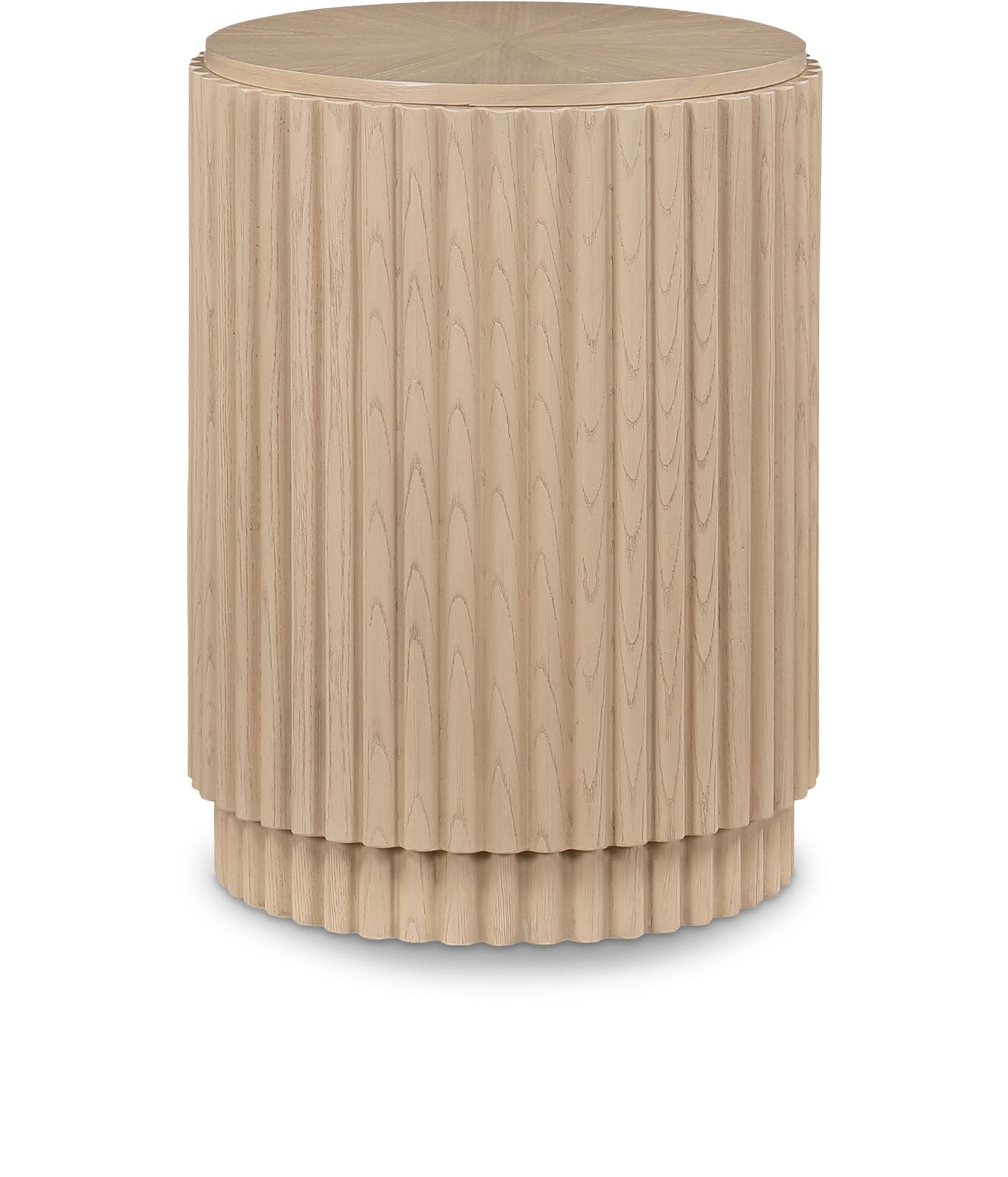 Indulge in the allure of this Ronin End Table. This table is sophisticated and charming, with a stunning finish and a fluted design that enhances the visual appeal of any living room or den. It's built from solid wood, MDF, and oak veneer, ensuring its durability and making it the focal point of any gathering. The natural wood grain variation gives this end table a unique appearance, while its mid-century design enables it to blend seamlessly into any space you choose to use it in.
