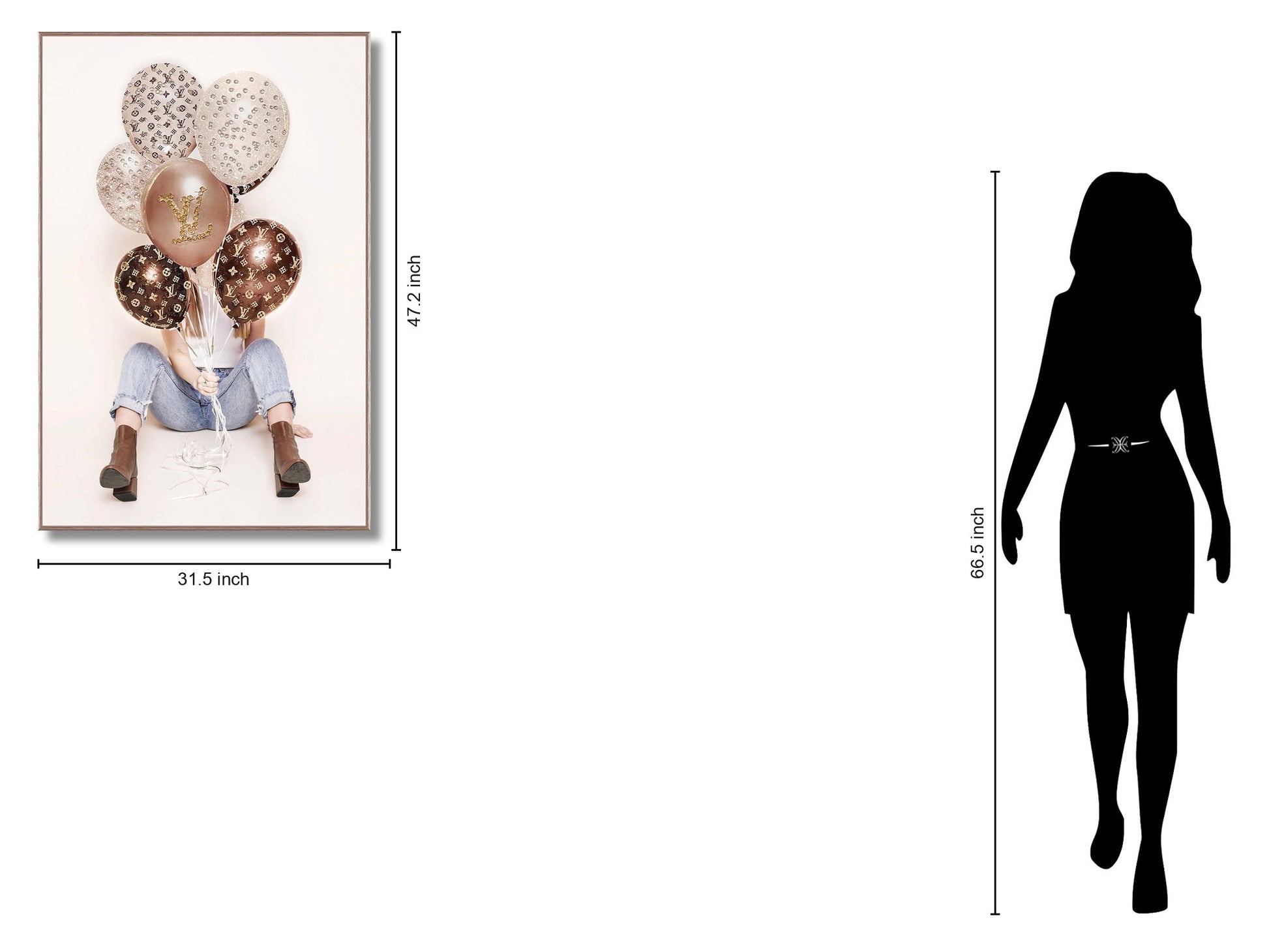 "Fashion Balloons" captures a chic and playful moment with a contemporary touch. This framed graphic art piece features a stylish figure holding a cluster of glossy, foil-embellished balloons, each adorned with intricate patterns and shimmering accents. The rose gold frame complements the warm tones and adds a luxurious finish, making it a perfect statement piece for living rooms, bedrooms, or offices. Hand-applied details and a gloss-coated surface enhance the texture and depth, creating a unique artwork that radiates sophistication and charm. Ready to hang and designed to elevate any modern space with a blend of glamour and fun.