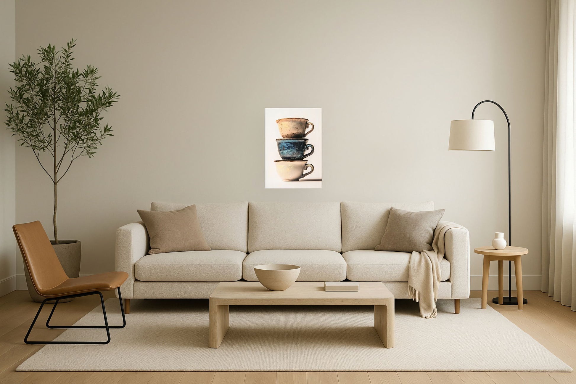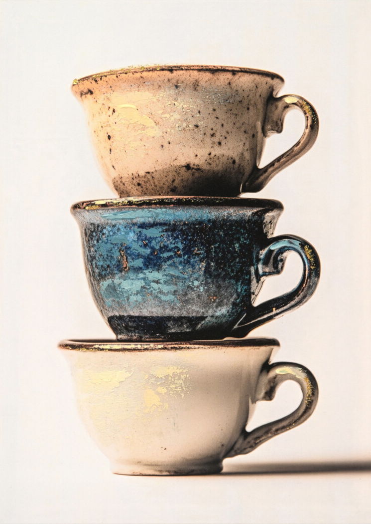 Discover the charm of rustic elegance with this captivating photograph of stacked cups. Each cup features unique textures and subtle glitter accents, creating a harmonious blend of colors. Perfect for adding a touch of warmth and character to your kitchen or dining area.