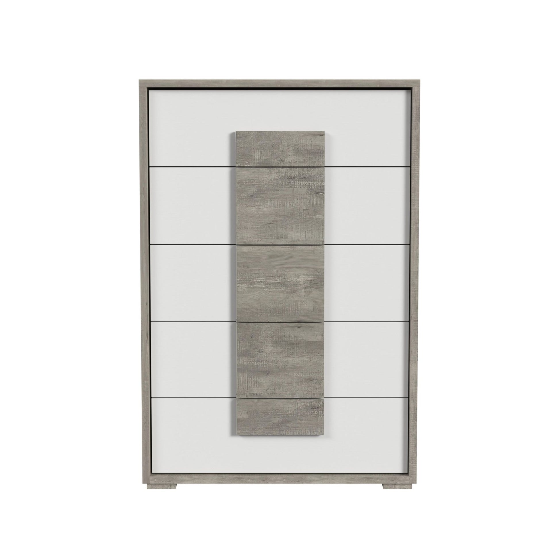Accent your bedroom with the eye-catching design of the San Matteo 5-Drawer Chest. Constructed of durable engineered wood set in a striking dual toned finish, this piece is sure to become a focal point in any space. The white panels instantly draw the eye and perfectly complement the light toned, depth creating veneer. Drawers made with skillful dovetailing and ball bearing glides are outwardly adorned with oversized pulls, creating a distinguishing appearance, while the top drawer is thoughtfully fitted with protective felt lining. For a unique and practical piece, the San Matteo 5-Drawer Chest is sure to please.