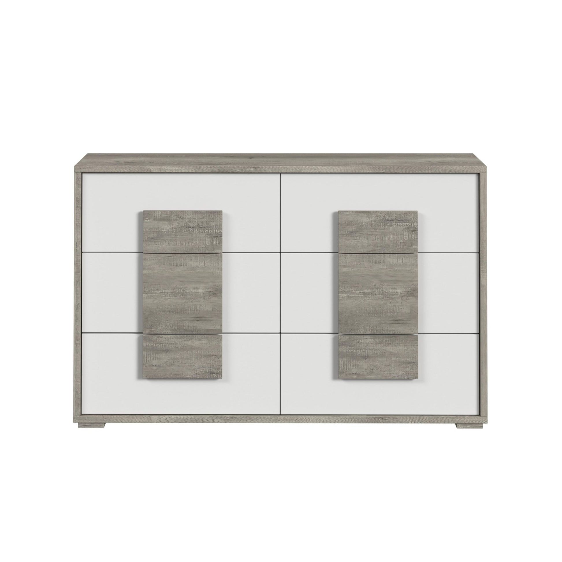Accent your bedroom with the eye-catching design of the San Matteo 6-Drawer Dresser. Constructed of durable engineered wood set in a striking dual toned finish, this piece is sure to become a focal point in any space. The white panels instantly draw the eye and perfectly complement the light toned, depth creating veneer. Drawers made with skillful dovetailing and ball bearing glides are outwardly adorned with oversized pulls, creating a distinguishing appearance, while top drawers are thoughtfully fitted with protective felt lining. For a unique and practical piece, the San Matteo 6-Drawer Dresser is sure to please.