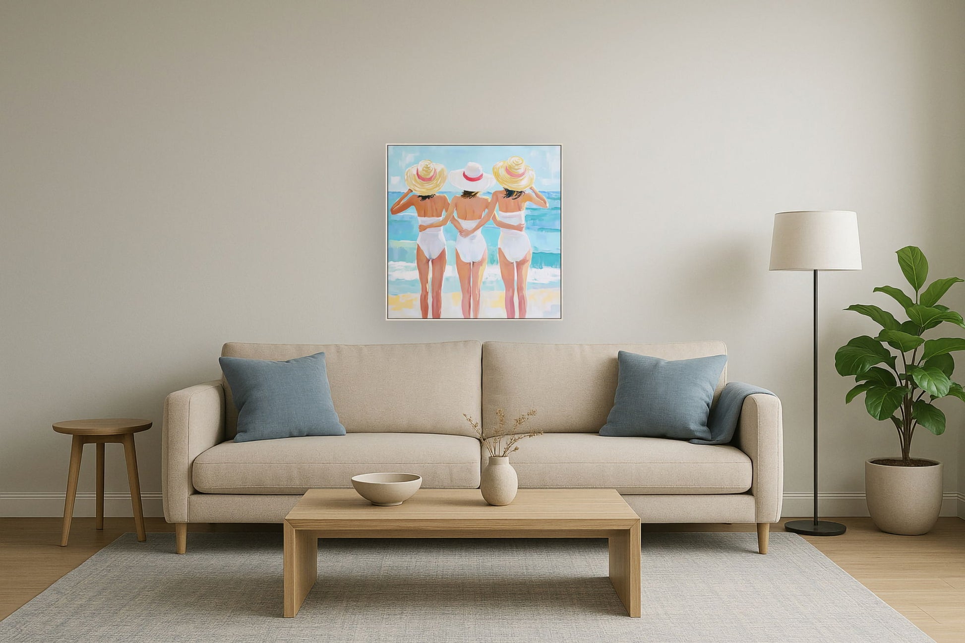 Celebrate friendship and summer vibes with "Three Sisters," a hand-painted oil canvas that captures the carefree spirit of three women embracing by the sea. This contemporary piece features soft pastel tones and textured brushwork, bringing warmth and joy to any living room. Framed in light beige polystyrene, it arrives ready to hang, making it a perfect statement for your home. Each purchase supports a meaningful cause, donating a meal to a hungry child, adding heart to your art collection.