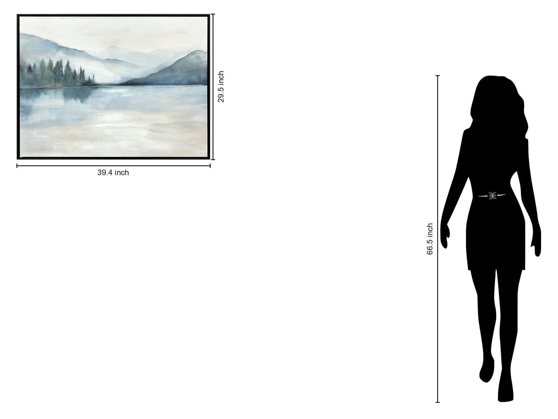 Experience tranquility with this serene landscape painting, capturing the gentle reflections of mountains and trees on a calm lake. The soothing blend of blues and greens evokes a sense of peace and relaxation, making it a perfect addition to any living space. This hand-embellished oil masterpiece is elegantly framed, ready to enhance your home with its calming presence.