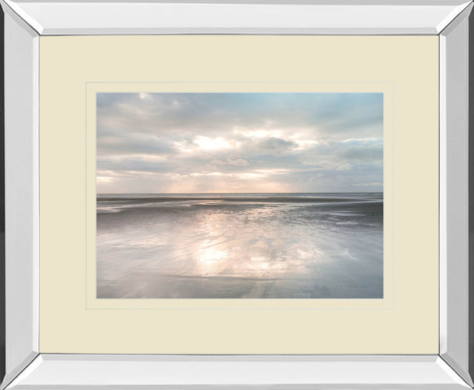 Step into a moment of calm with this stunning framed wall art that captures the quiet beauty of a coastal sunrise. Soft hues of cream, blue, and gray blend seamlessly across the reflective shoreline, inviting you to pause and breathe in the peaceful atmosphere. The mirrored frame adds a contemporary touch, enhancing the light and depth of the scene while the double matting offers a refined gallery finish. Protected by real glass, this piece preserves every delicate detail and vibrant tone, making it a perfect addition to your living room, office, or bedroom. Ready to hang, it effortlessly brings a serene coastal charm to any space, transforming your walls into a tranquil retreat.