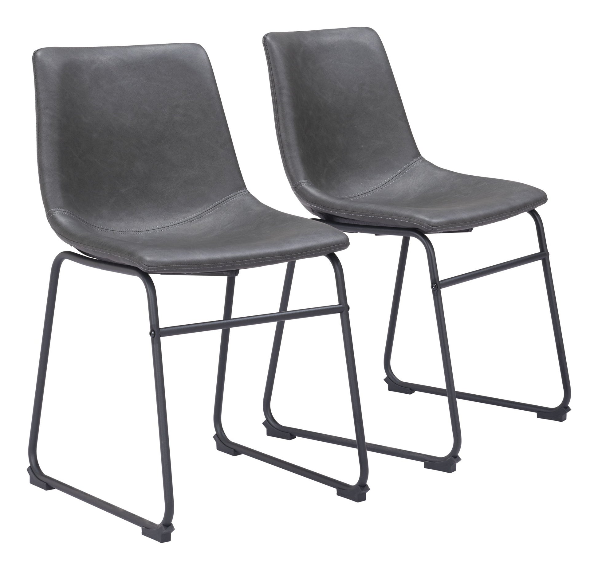 This dining chair's seat and back are built with a sculpted design for comfort. It's upholstered in a soft 100% Polyurethane fabric, with a slim profile metal base and a crossbar for stability. The frame is finished in matte black, for a universal appeal.