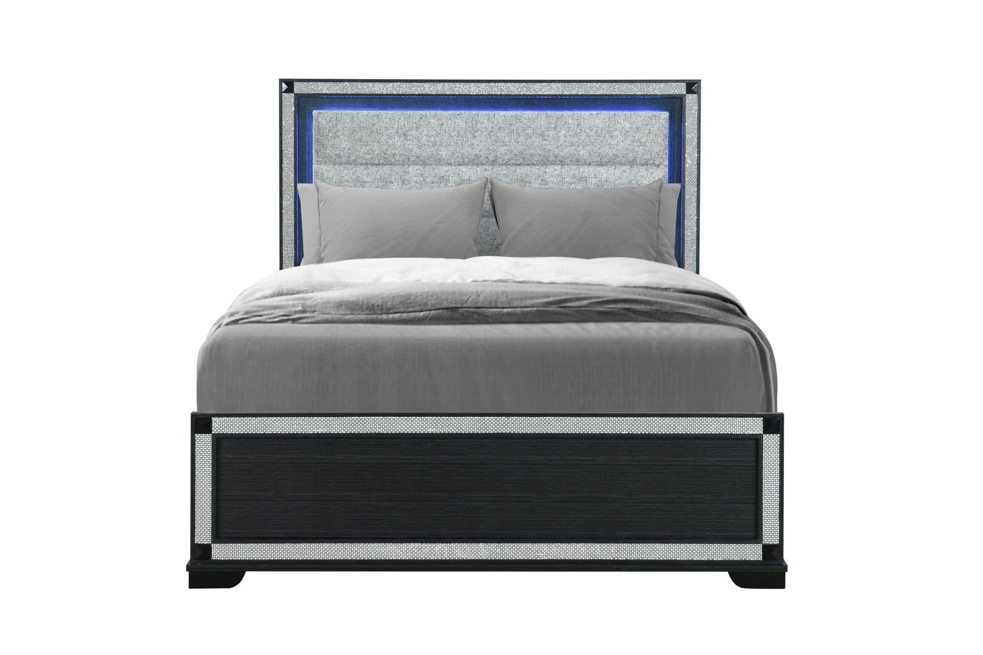 The Soleil Queen Bed blends modern sophistication with a touch of glamour. Its rich dark charcoal frame is paired with a grey upholstered headboard outlined in shimmering crushed crystal trim. The built-in LED lights add a warm, ambient glow, making it a show-stopping centerpiece for your bedroom.