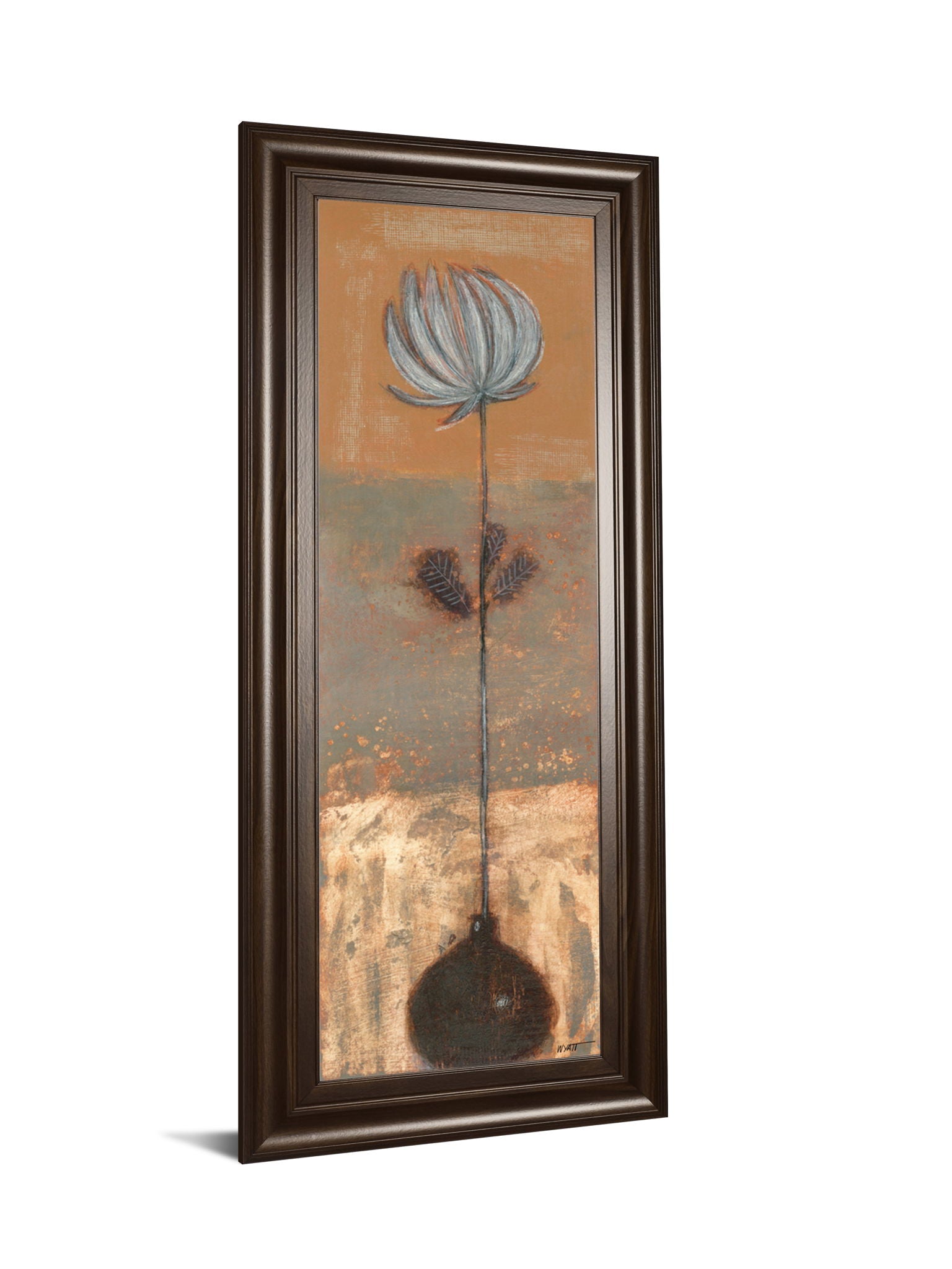 Discover a serene blend of nature and artistry with this delicate bloom piece, showcasing a slender flower rising gracefully from a dark vase. Rendered in soft, muted hues of brown, orange, gray, and beige, the mixed media textures invite a closer look, revealing subtle layers that evoke warmth and tranquility. Framed in a rich cinnamon mocha finish, this vertical wall art brings a touch of sophisticated calm to any living room, bedroom, or office, effortlessly complementing transitional decor styles with its timeless charm and refined presence.