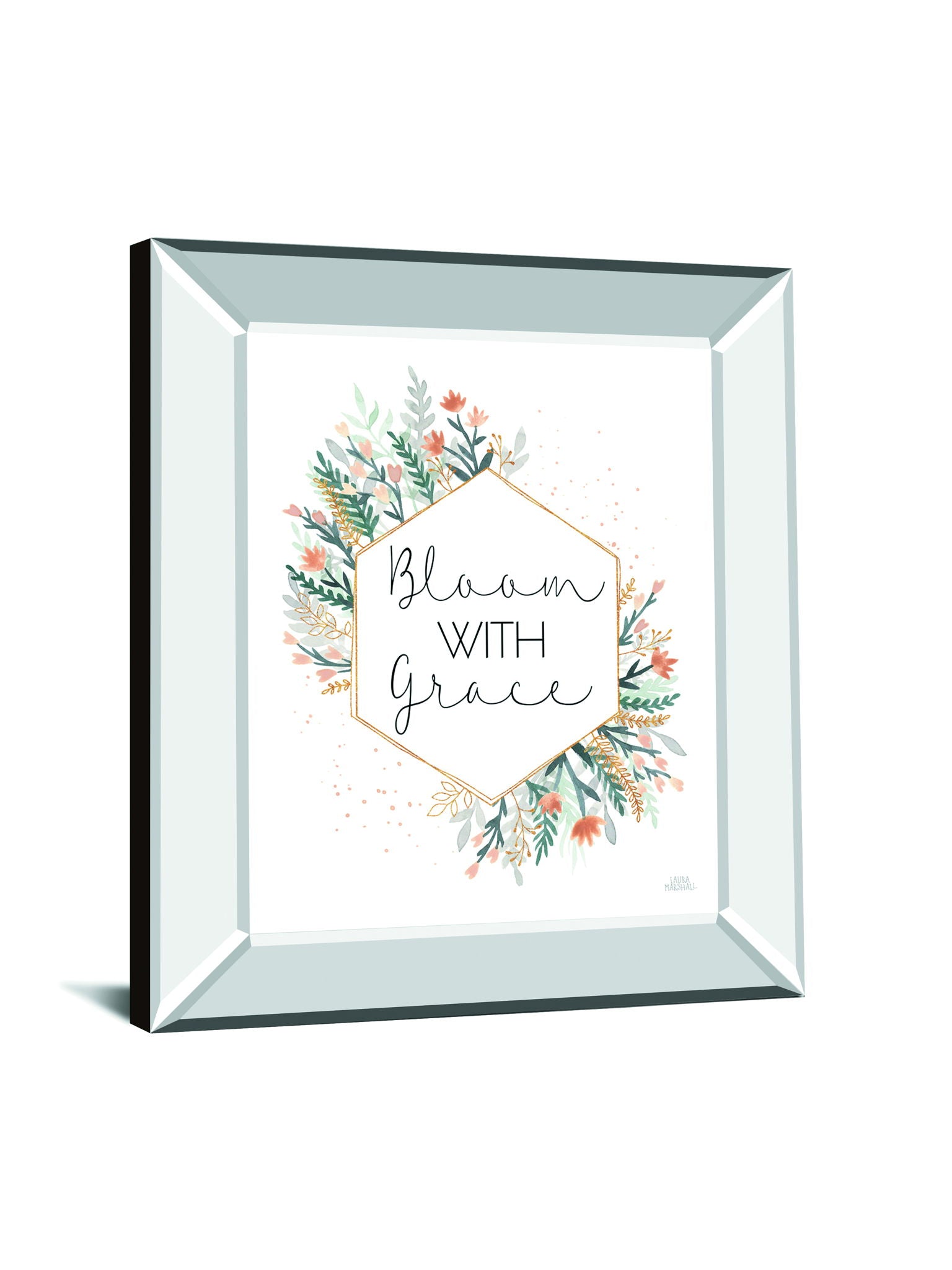 Invite a touch of serene elegance into your home with this beautifully framed piece featuring the inspiring phrase “Bloom with Grace.” Delicate watercolor florals in soft peach, green, and gray hues surround the gentle typography, creating a harmonious blend of nature and art. The mirrored frame adds a modern reflective detail that enhances the artwork’s subtle colors and offers a sophisticated shimmer. Protected by crystal-clear glass, this vertical piece is ready to hang and perfect for adding a calming, inspirational accent to living rooms, bedrooms, or offices.