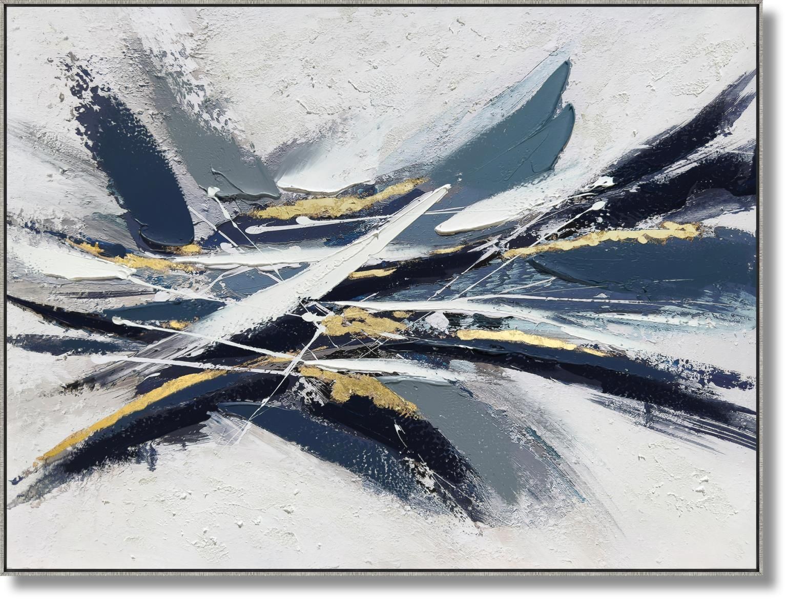 Immerse yourself in the dynamic energy of “Gold Streaked Midnight Abstract,” a hand-painted oil painting on canvas that transforms any space with its bold strokes and shimmering gold accents. This contemporary piece features a striking blend of deep midnight blues, soft grays, and crisp whites, enlivened by hand-applied gold streaks that add texture and depth. Housed in a sleek silver frame, this artwork arrives ready to display with professional mounting hardware, making it a perfect statement for living rooms, offices, or galleries. Each purchase supports a meaningful cause, donating a meal to a hungry American child, allowing your art to make a difference beyond your walls.