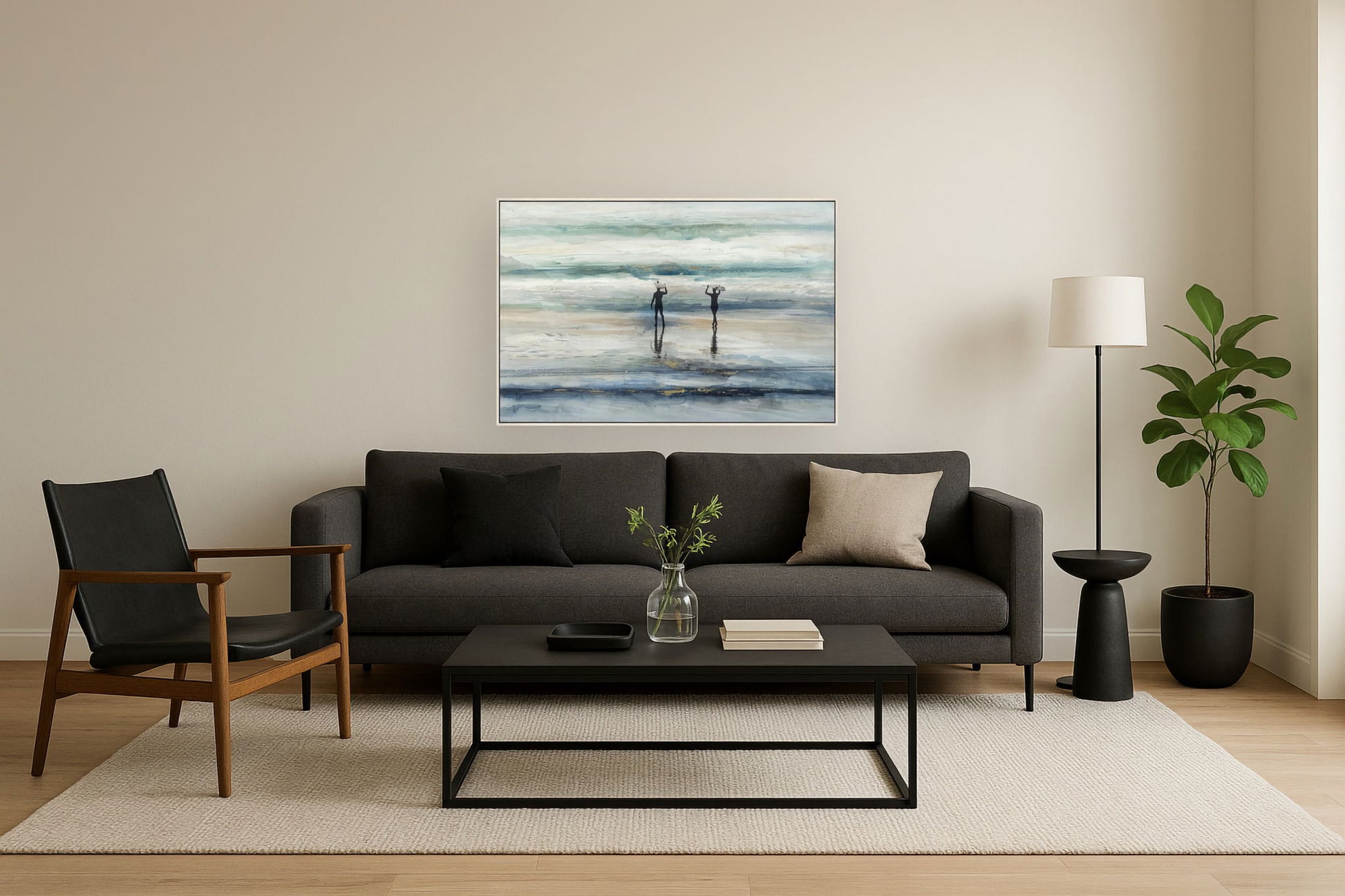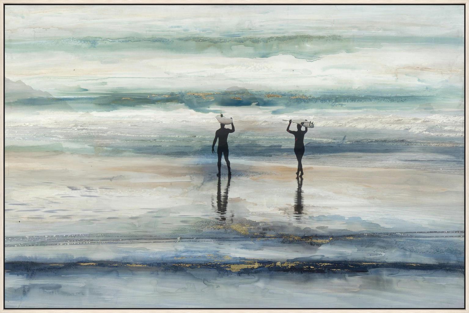 “Silhouette Beach” captures the serene beauty of a coastal scene where two surfers stand poised at the water's edge, surfboards in hand, ready to embrace the waves. This hand-painted oil canvas, framed in a light beige polystyrene frame, combines soft blues, grays, and sandy tones with delicate gold accents to evoke a tranquil, reflective mood. The artist’s hand-applied embellishments add texture and depth, making each piece unique. Perfectly suited for living rooms, bedrooms, or offices, this contemporary coastal artwork invites a peaceful, adventurous spirit into your space while supporting a meaningful cause—each purchase donates a meal to a hungry American child.