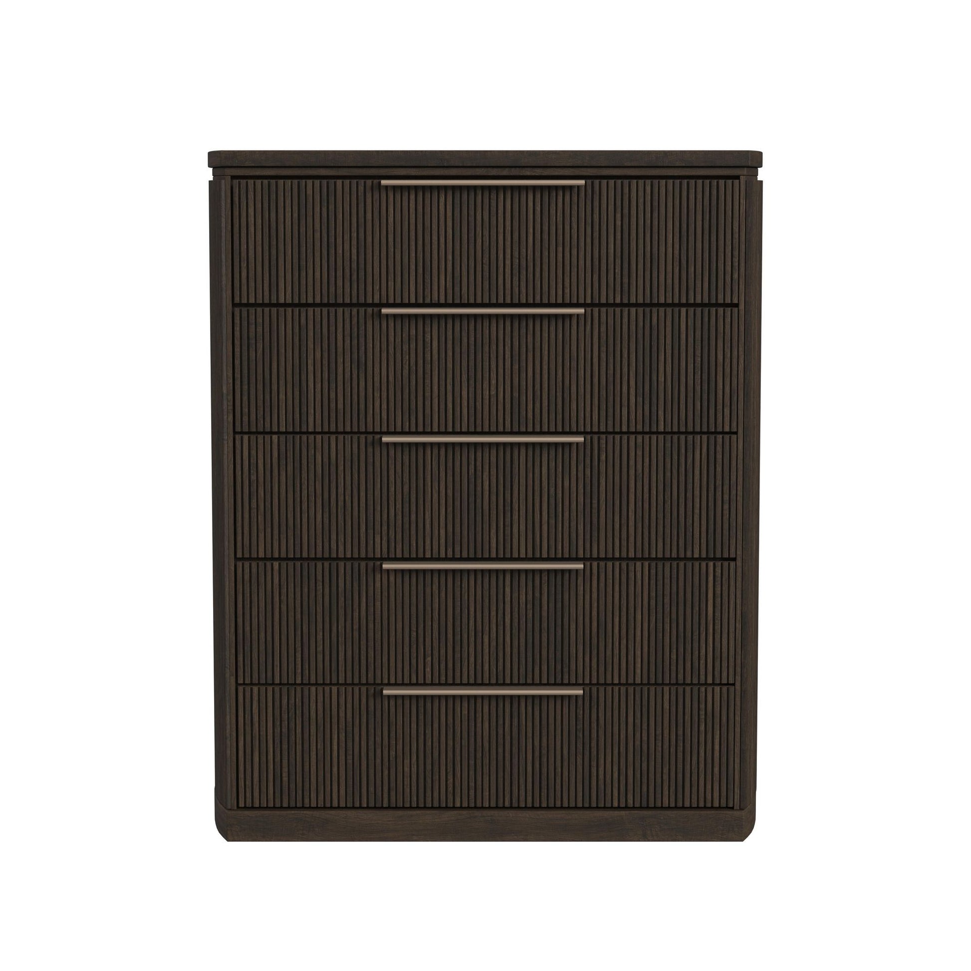The Sylvie 5-Drawer Chest in Dark Brown is a refined addition to your bedroom. Outfitted with fine decorative fluting and sleek, understated silver drawer pulls, the elegance of this piece is only matched by its quality construction. Each drawer features skillful dovetailing and smoothly operating ball bearing glides, while the top drawer specifically is thoughtfully fitted with felt lining. For a piece that is as durable as it is elegant, the Sylvie 5-Drawer Chest in Dark Brown is sure to please.