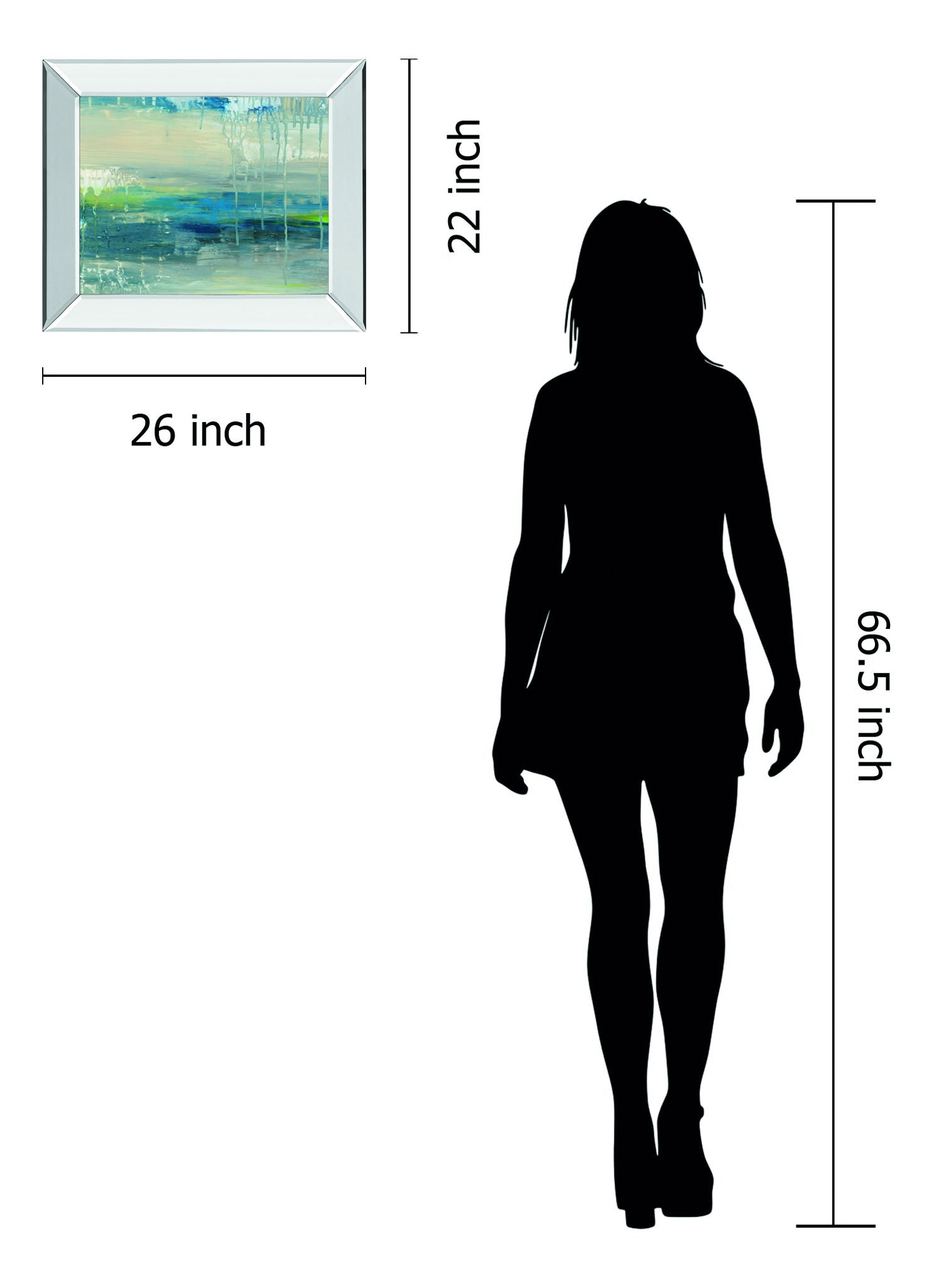 Immerse yourself in the tranquil beauty of this contemporary abstract piece that blends soothing blues, greens, and soft neutrals with an artistic drip effect. Encased in a sleek 2.5-inch mirrored frame, it reflects light to enhance the vibrant colors and adds a luxurious depth to any living room or office space. Crafted with premium real glass, this artwork preserves the vivid details and color vibrancy while offering crystal-clear protection. Ready to hang and proudly made in the USA, it effortlessly transforms modern interiors with its calming yet dynamic presence.