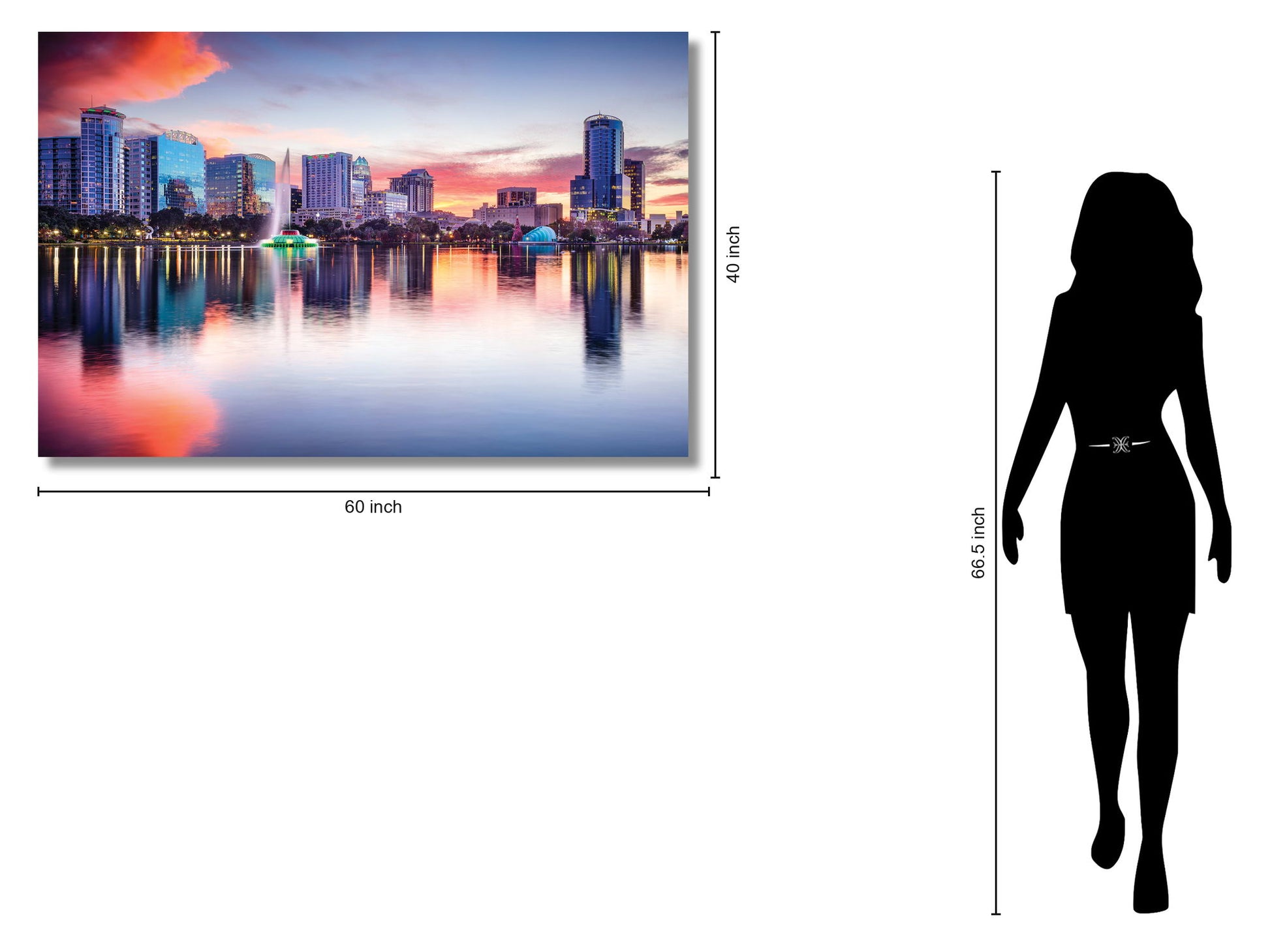 Capture the vibrant essence of Orlando with this stunning tempered glass wall art. Featuring a breathtaking cityscape at sunset, the artwork is printed and hand-embellished beneath durable tempered glass, offering a sleek, dimensional finish that enhances the vivid colors and reflections. This contemporary piece is designed for easy hanging with angled sawtooth hangers, making it a perfect addition to living rooms, offices, or hospitality spaces. Beyond its beauty, each purchase supports a social cause by donating a meal to a hungry American child, blending art with meaningful impact. Elevate your space with this captivating view of Orlando's skyline.