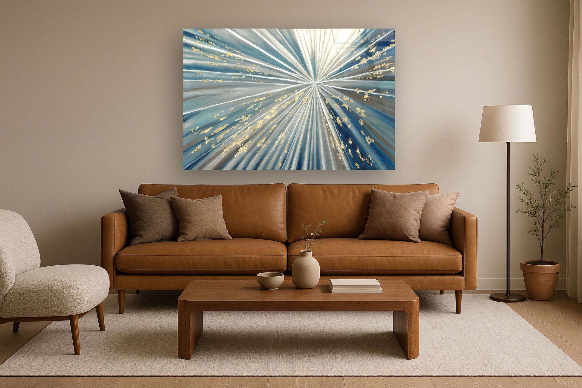 Eclipse Burst captures a dynamic explosion of light and color, rendered on tempered glass for a sleek, contemporary finish. This abstract piece features radiant blues, grays, and shimmering gold accents that create a sense of depth and movement. Hand-embellished beneath toughened glass, it offers both durability and a striking dimensional shine. Perfect for modern living rooms, offices, or any space seeking a bold artistic statement, this artwork comes ready to hang with sawtooth hangers for easy, level mounting. Each purchase supports a meaningful cause, donating a meal to a hungry American child, making this piece not only beautiful but impactful.